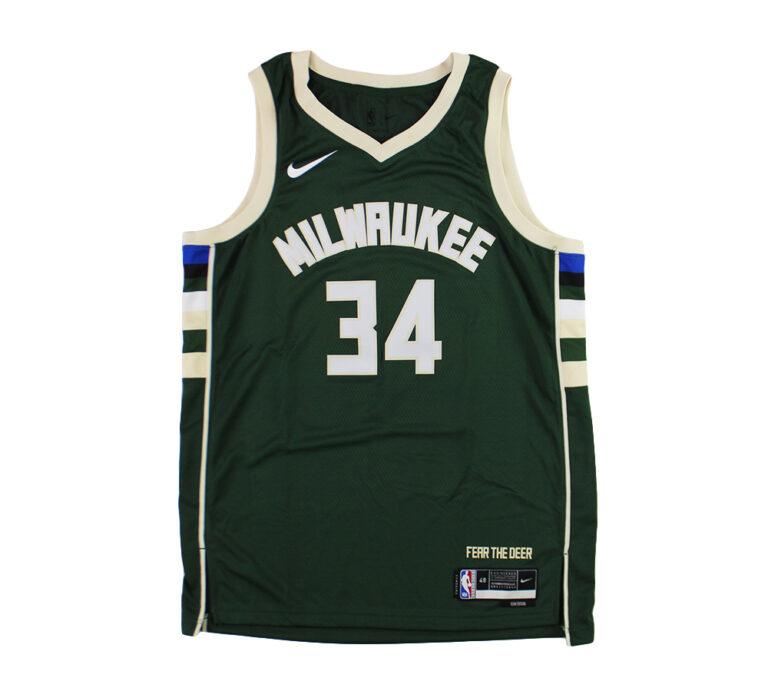 Nike Swingman jersey with everything printed on, size L. Hand-signed by Giannis Antetokounmpo (Milwaukee Bucks).