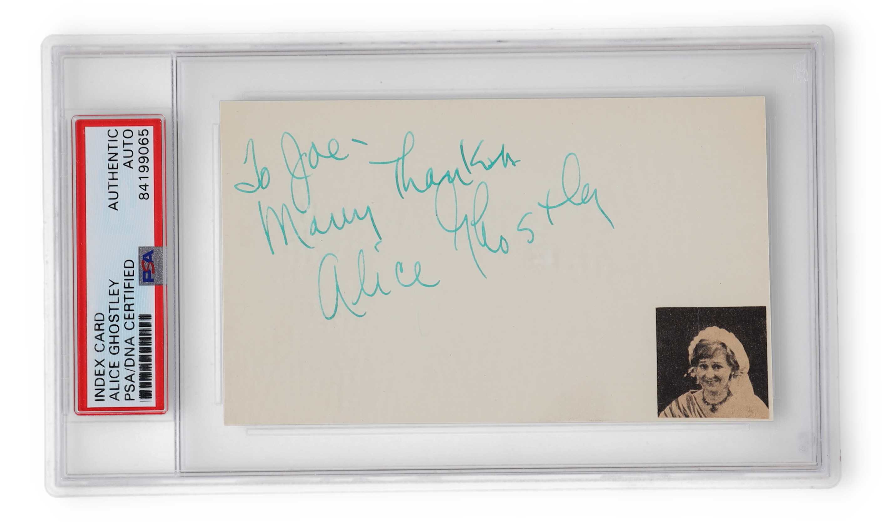 Index card measures 3" x 5" in size. Hand-signed and inscribed by Alice Ghostley (D. 2007). Please note, inscription has been personalized to "Joe".