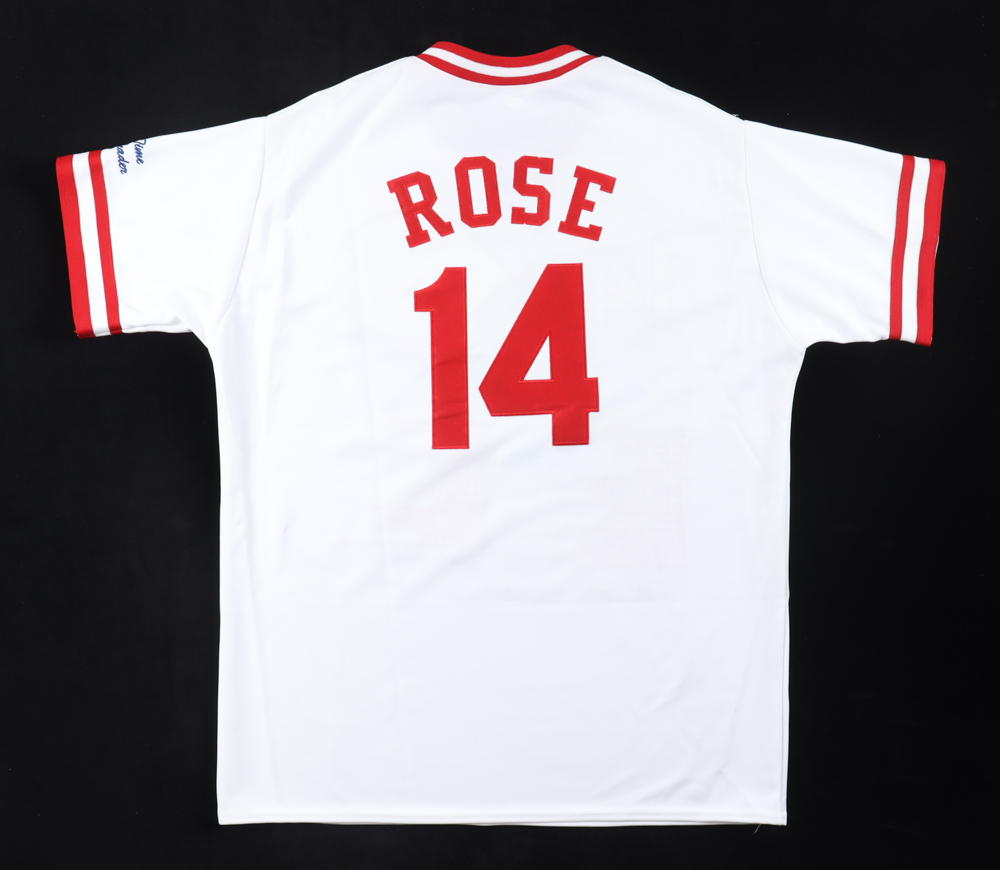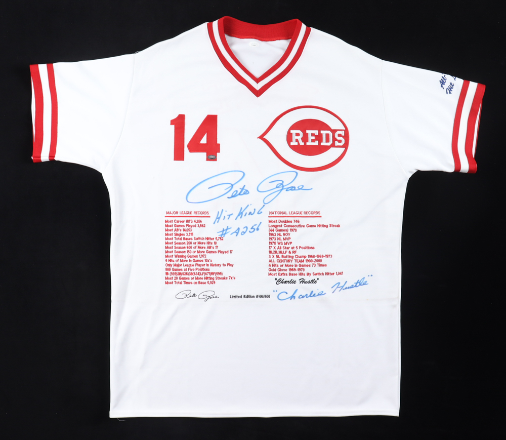 Custom jersey. Everything sewn on, size XL. Hand-signed and inscribed by Pete Rose. Rose's career highlights have been hand-sewn on below the front logo. The Jersey is limited edition and is numbered #45 / 500. Please note, the jersey is stained. Please refer to the photos for the condition of the item.