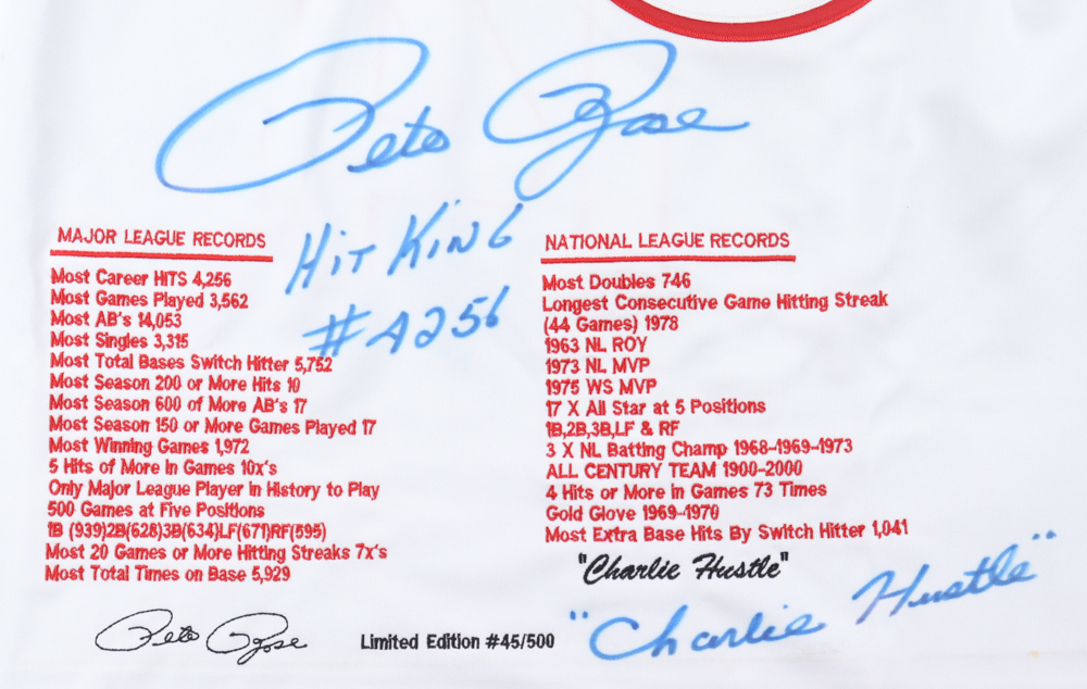Pete Rose Signed LE Career Highlight Stat Jersey Inscribed "Hit King", "#4256", & "Charlie Hustle" (JSA)