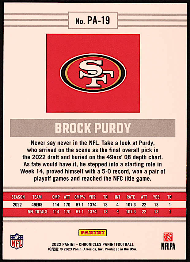 Brock Purdy 2022 Panini Chronicles Panini #19 RC
