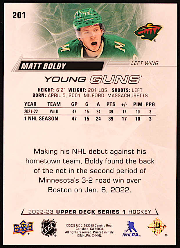 Matt Boldy 2022-23 Upper Deck #201 YG RC