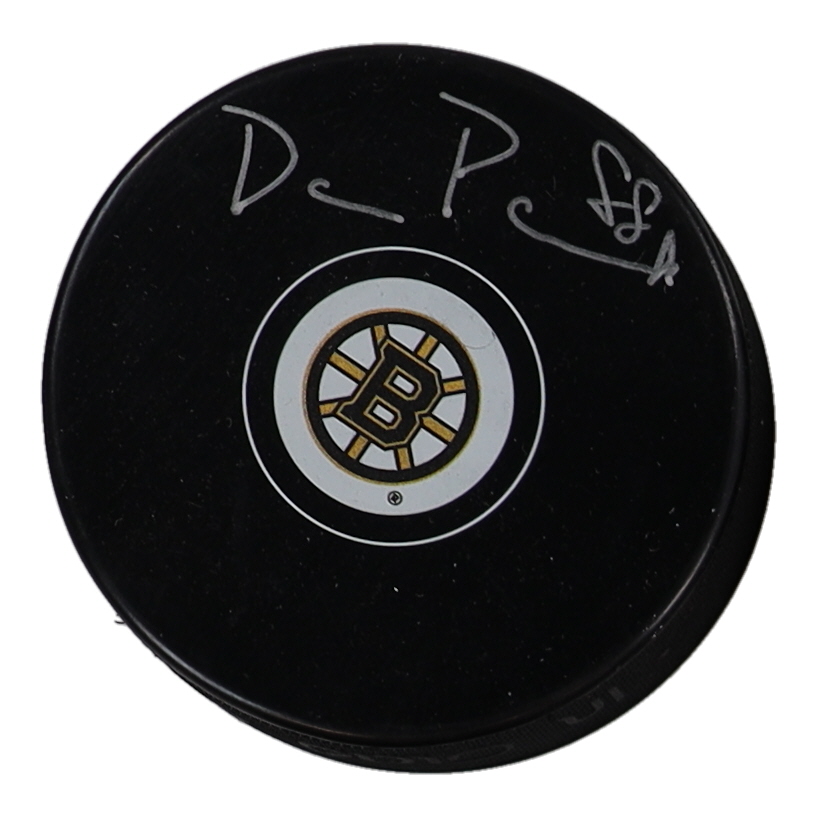 Boston Bruins logo hockey puck has been hand-signed by David Pastrnak.