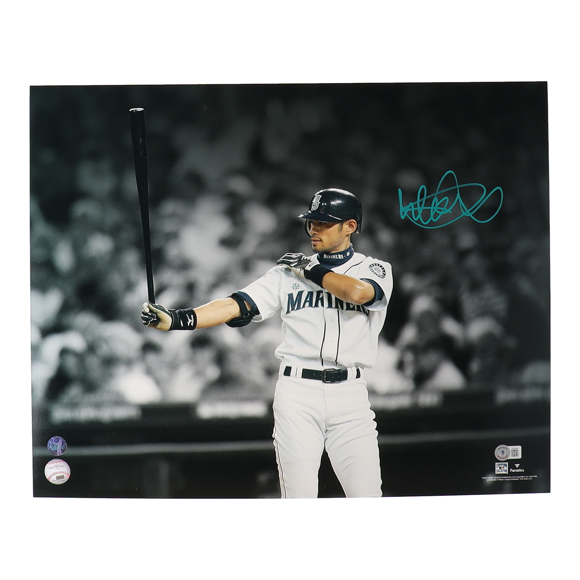 Photo measures 16" x 20" in size and has been hand-signed by Ichiro Suzuki (Seattle Mariners).