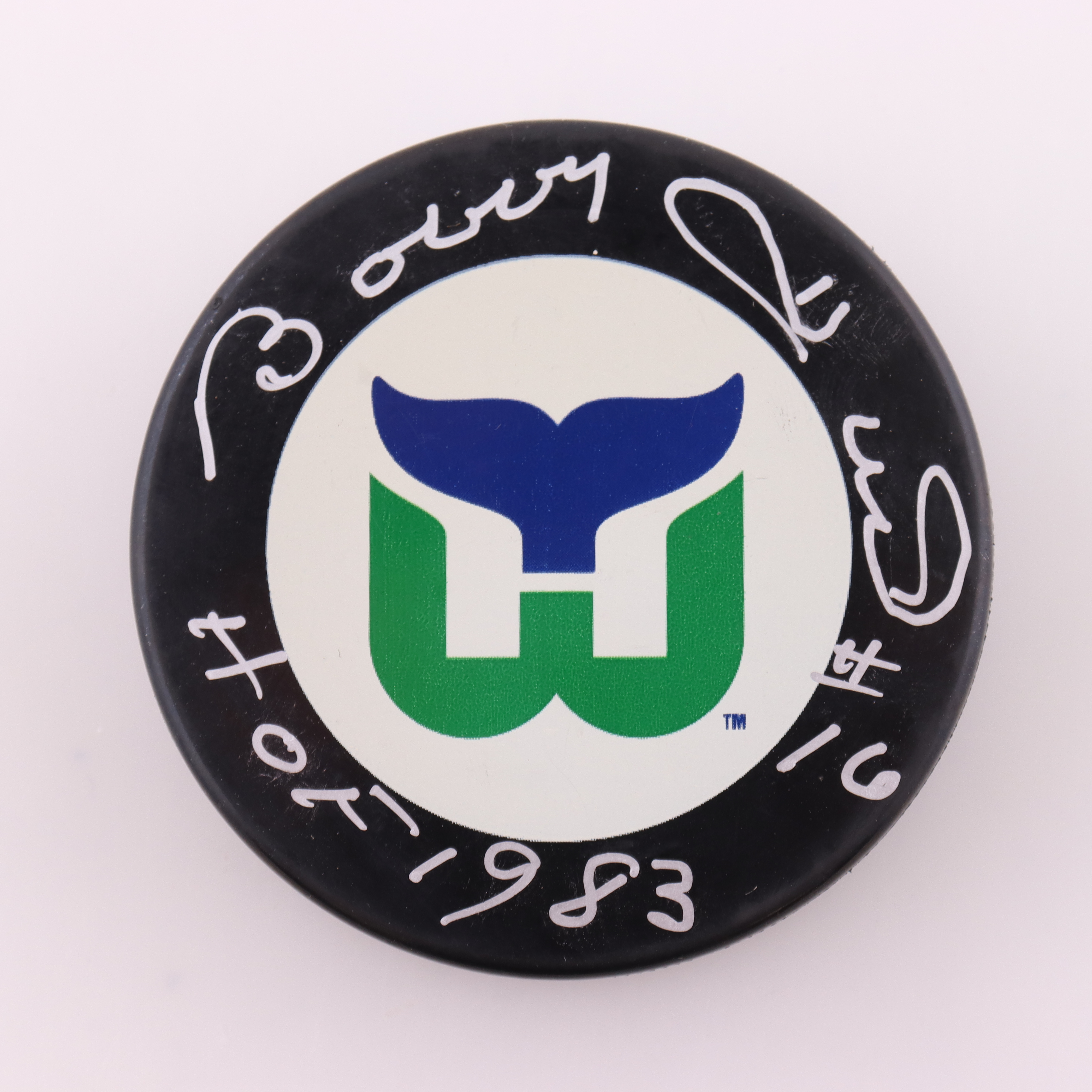 Hartford Whalers Logo hockey puck. Hand-signed and inscribed by Bobby Hull (HOF).