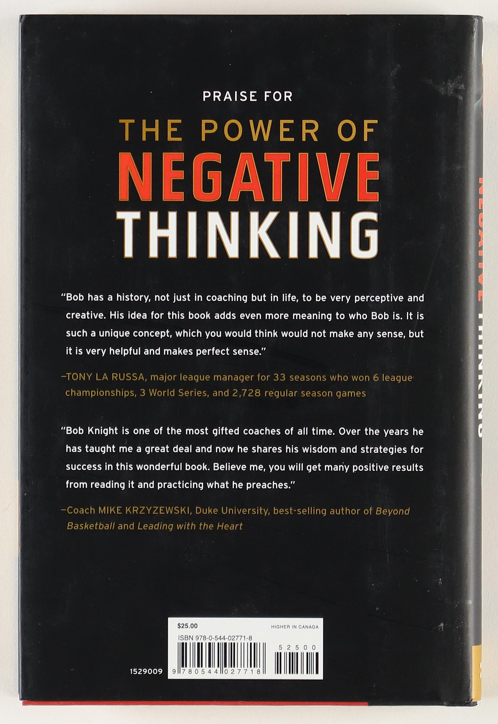 "The Power of Negative Thinking" hardcover book has been hand-signed on the inside title page by Bob Knight (Indiana Hoosiers, HOF).