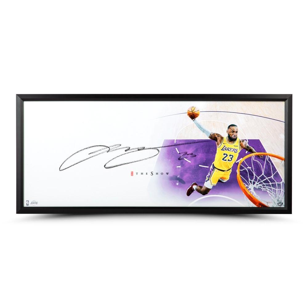 Custom framed display measures 20" x 46" in size and features a photo that has been hand signed by LeBron James (Los Angeles Lakers).