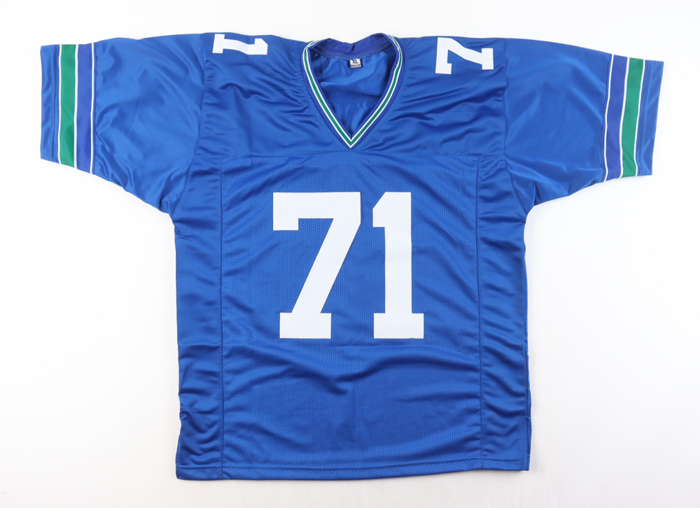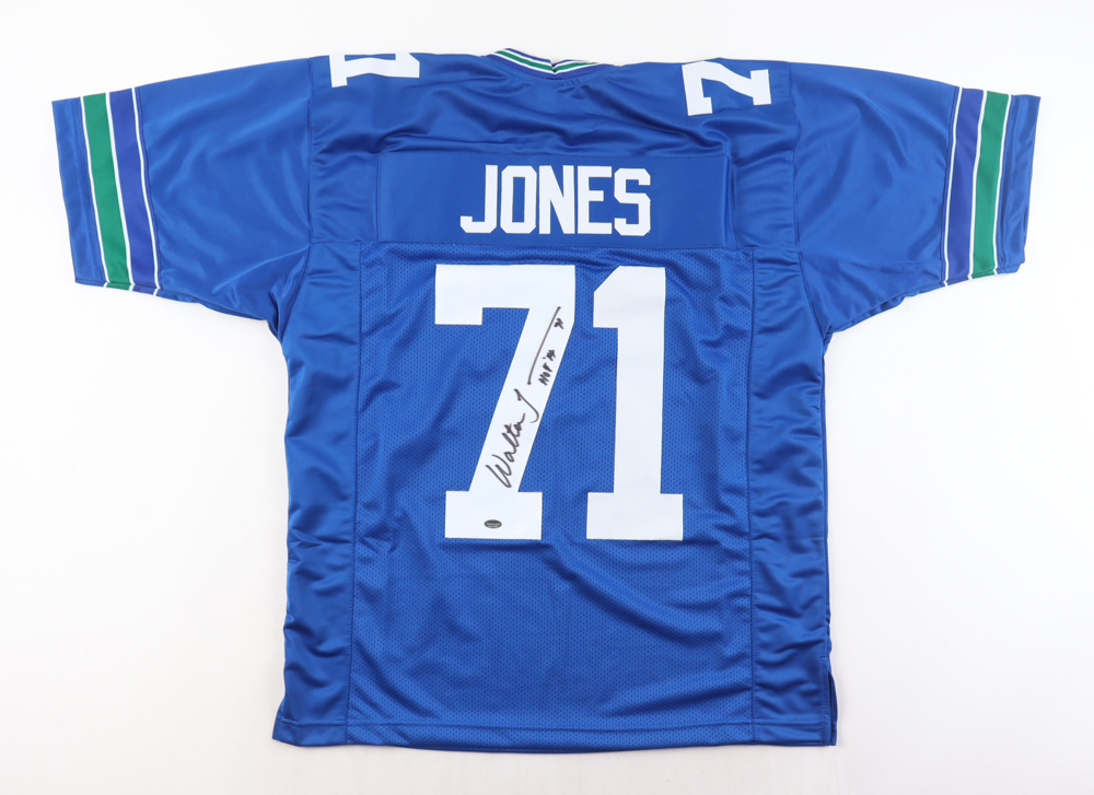 Custom jersey with everything sewn on, size XL. Hand-signed and inscribed by Walter Jones (HOF). Please note, the signature and inscription have bled.