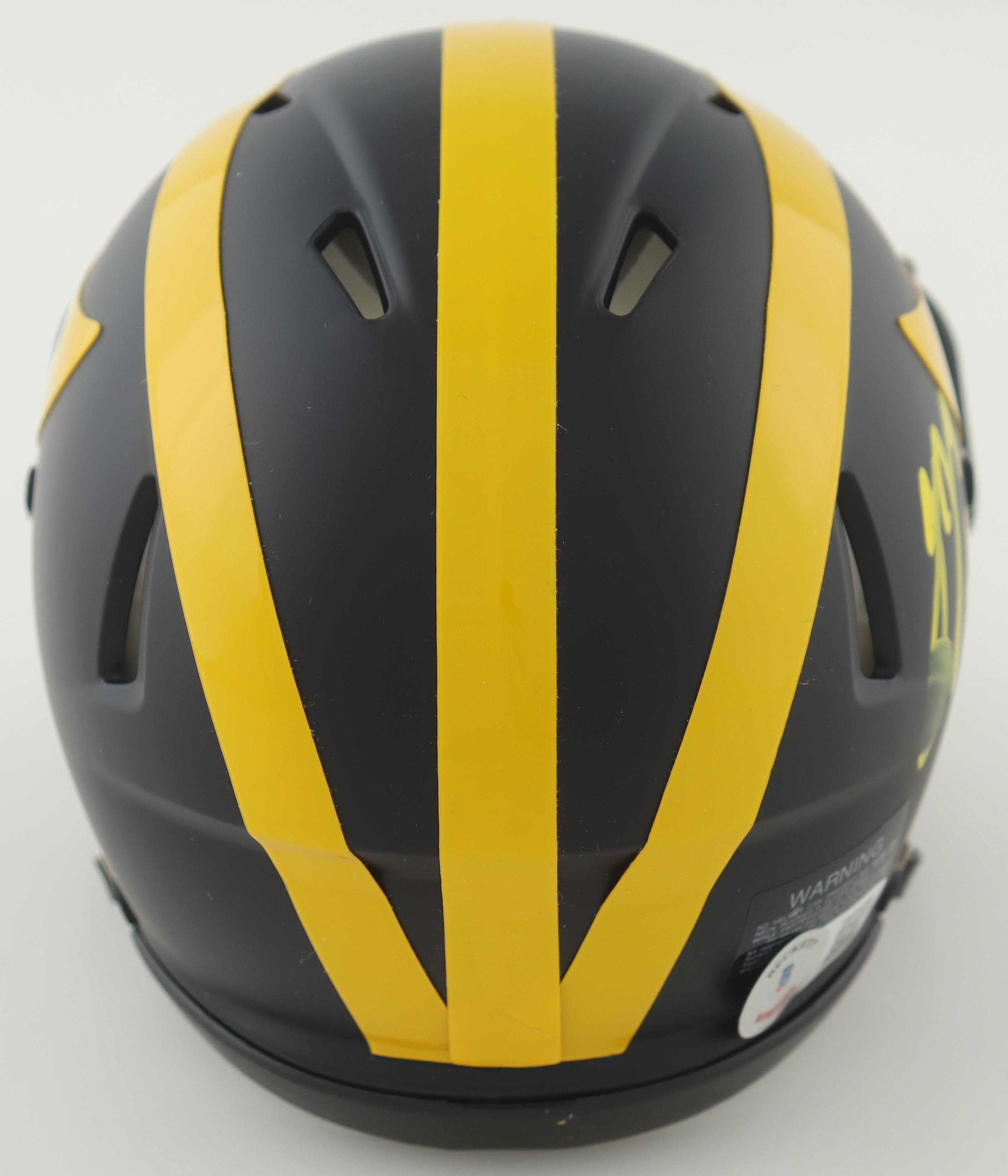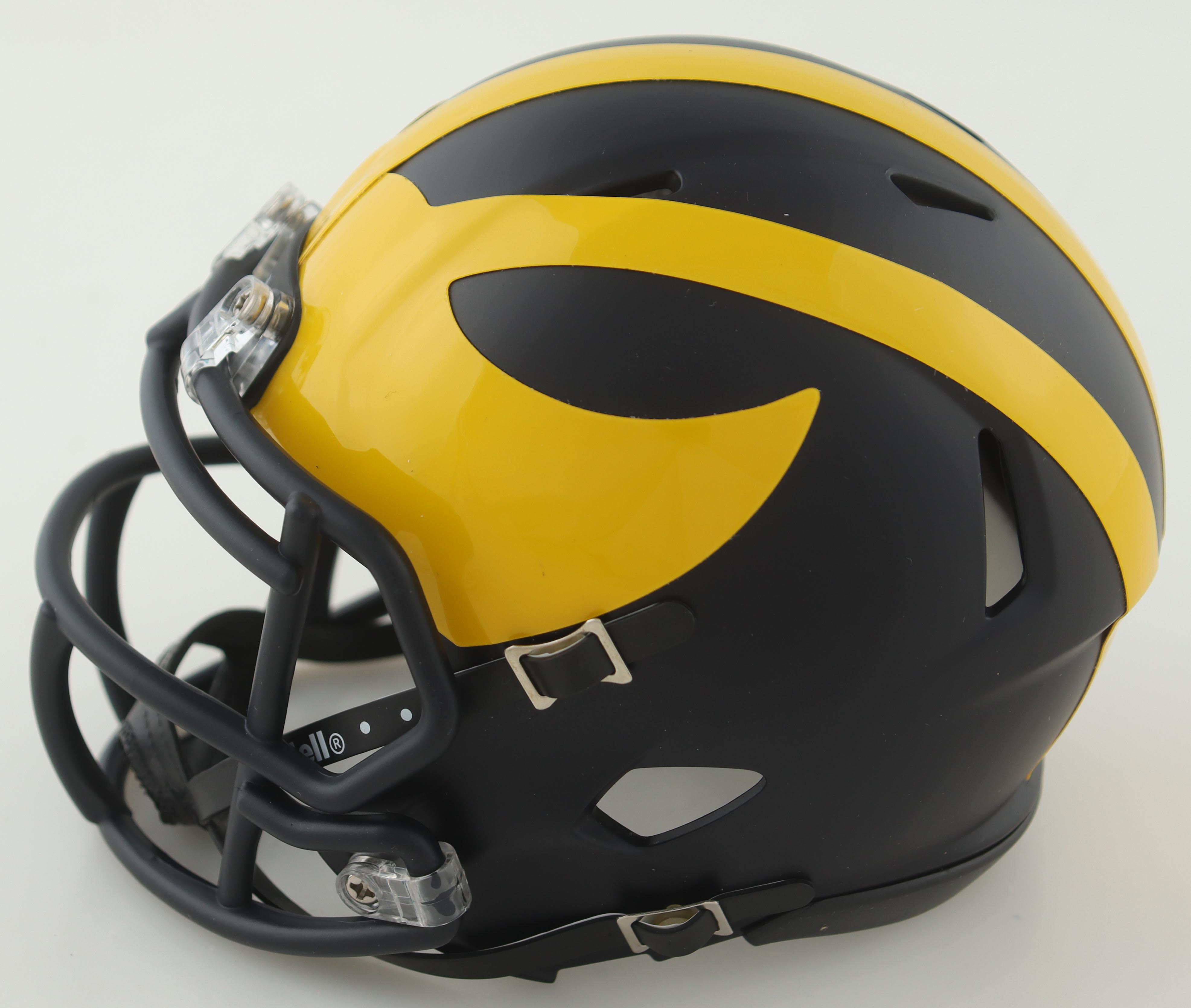 Riddell Michigan Wolverines Speed Mini Helmet. Hand-signed by J. J. McCarthy. Please note the signature is smudged.