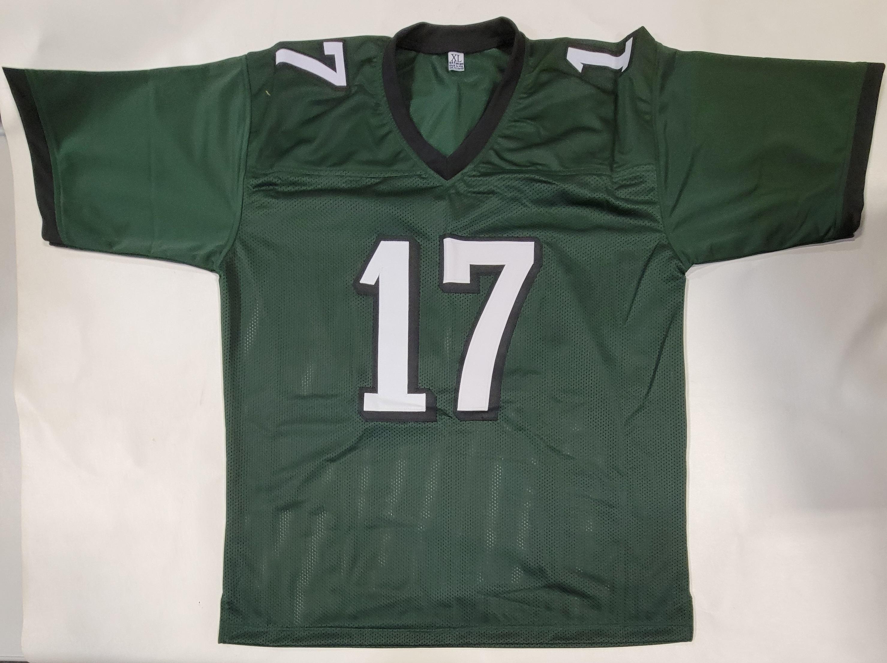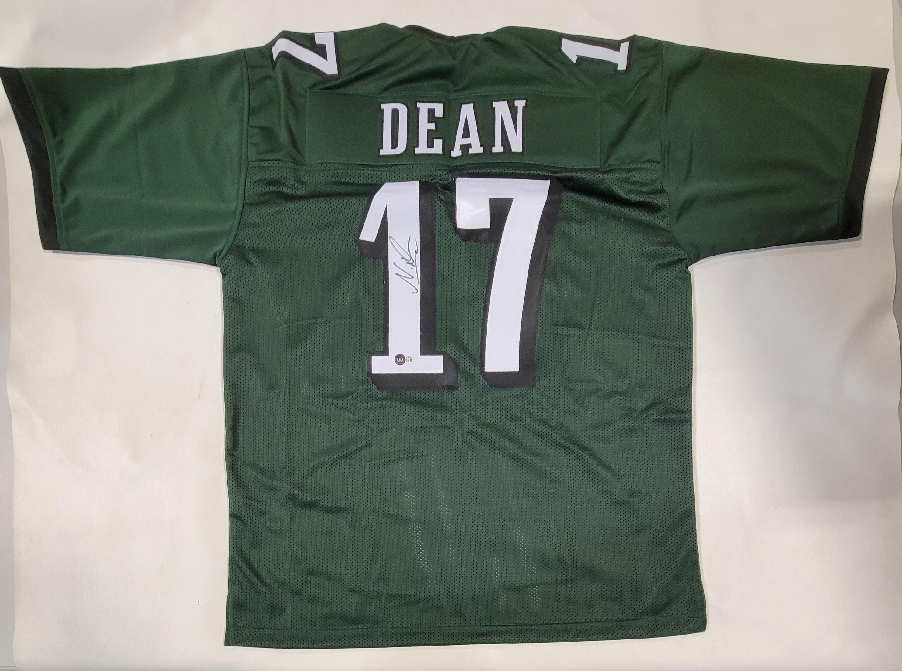 Custom jersey with everything sewn on, size XL. Hand-signed by Nakobe Dean.