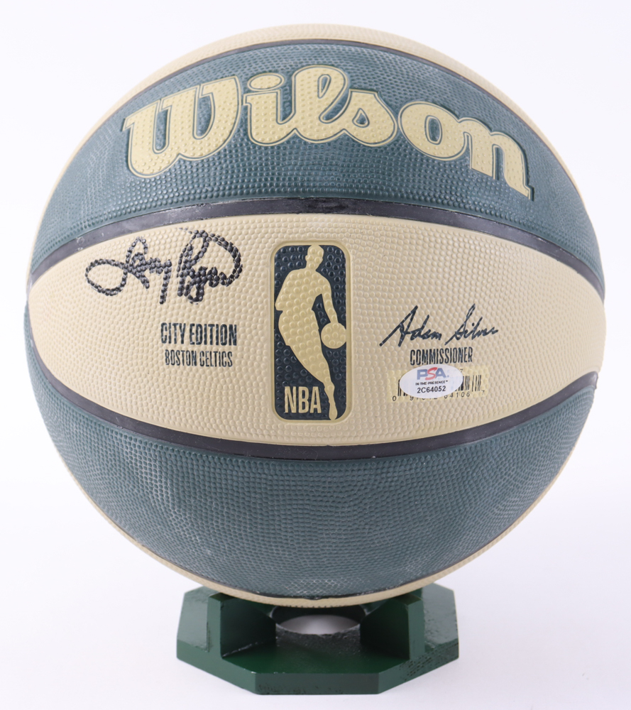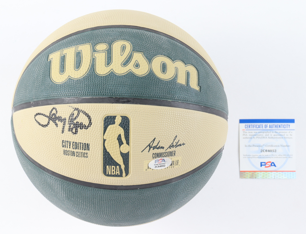 Larry Bird Signed NBA Celtics City Edition Basketball With Matching Green Display Stand (PSA)