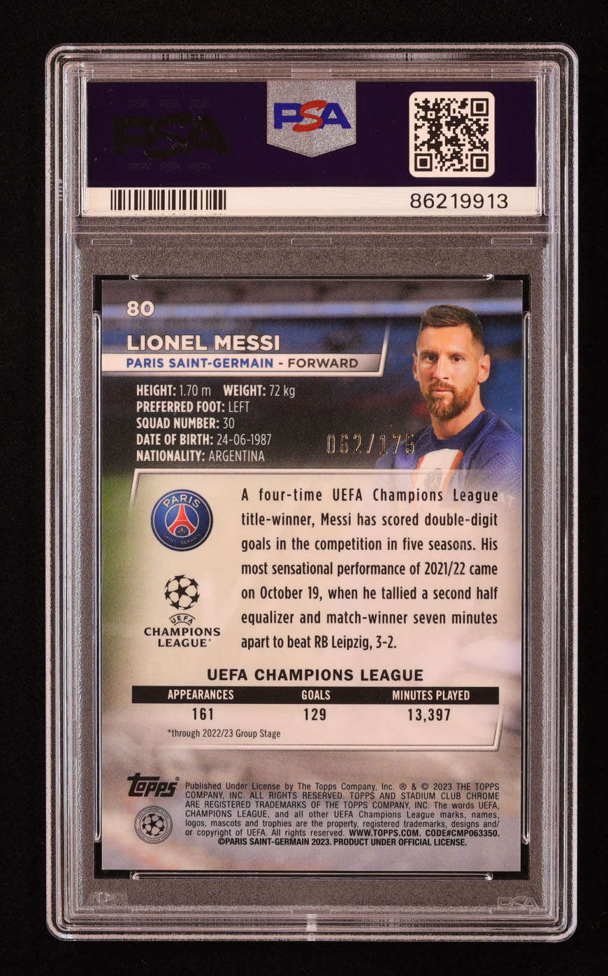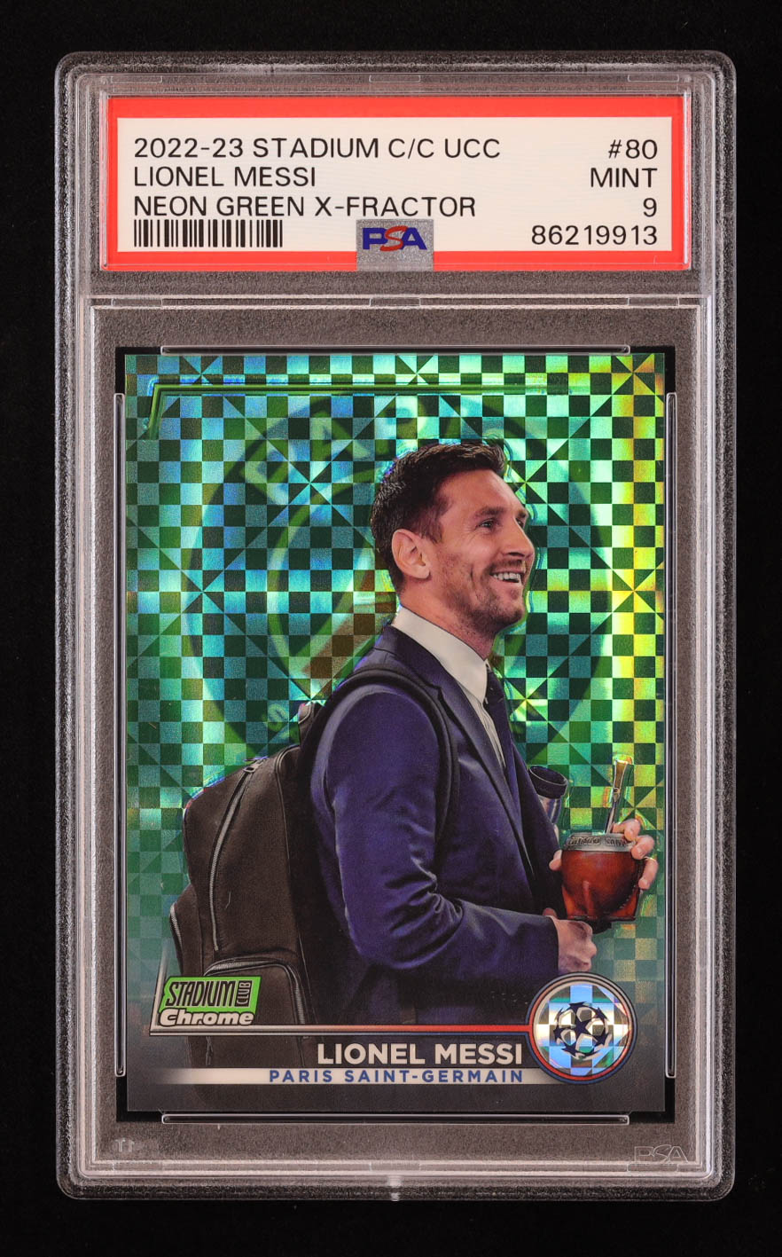 Lionel Messi 2022-23 Stadium Club Chrome UEFA Neon Green X-Fractor #80 #062/175 (PSA 9)