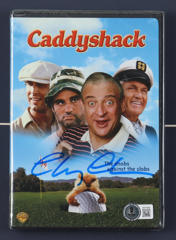 Custom frame measures approximately 18" x 33" in size and features a sealed DVD that has been hand-signed by Chevy Chase (Ty Webb). The display also includes a movie poster print.