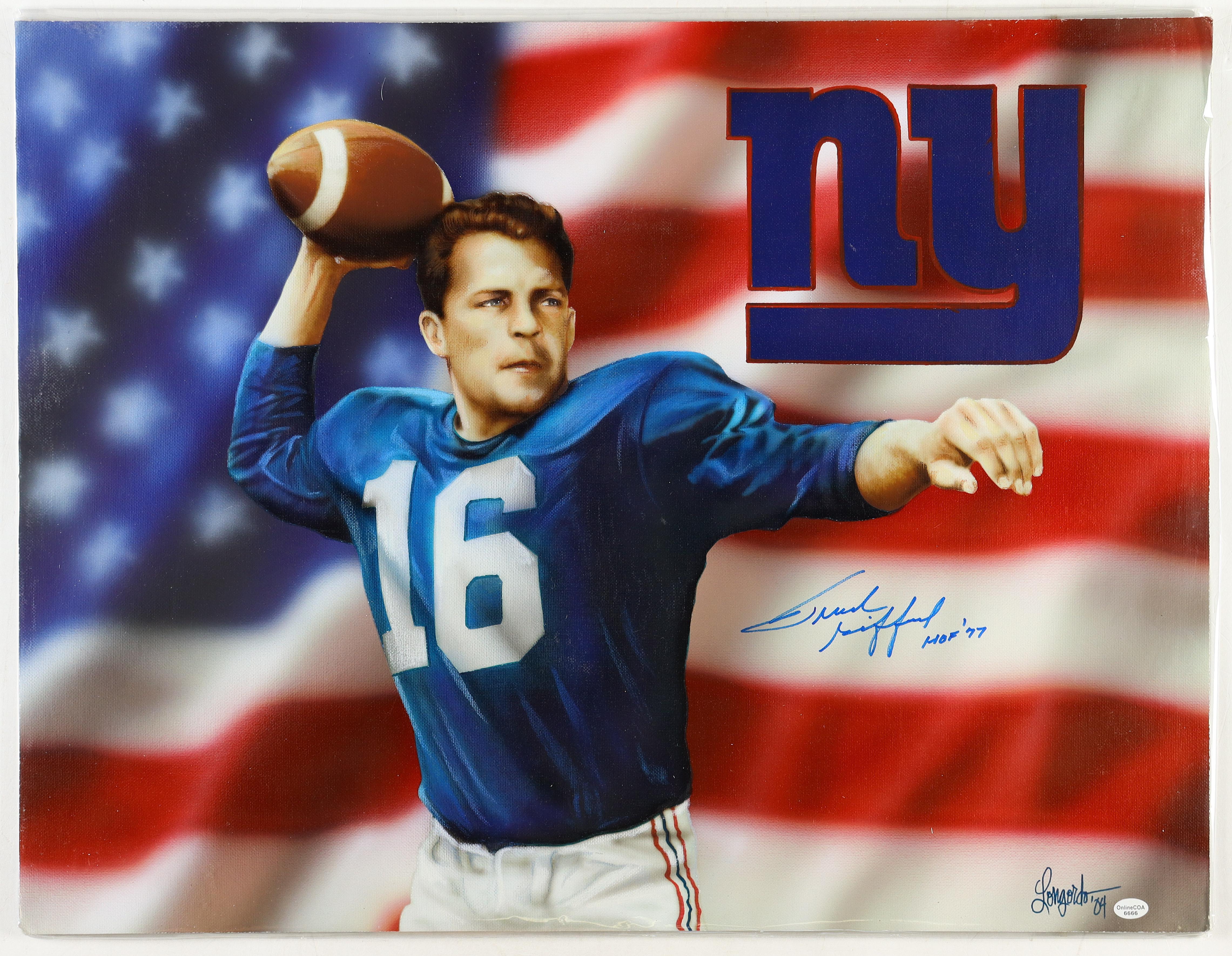 Print board measures approximately 20" x 26" in size. Hand-signed by Frank Gifford (D. 2015, New York Giants, HOF). Original acrylic and prismacolor painting on canvas has been hand-painted by the artist Gary Longordo.