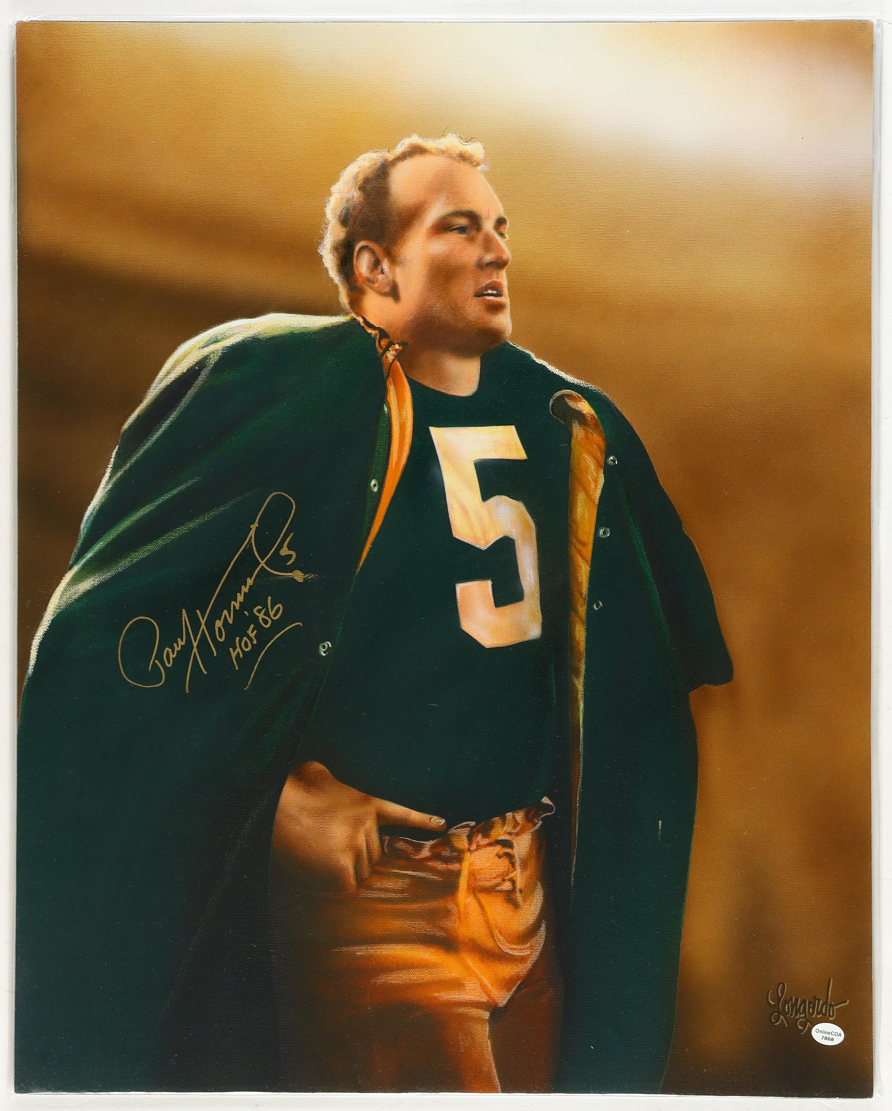 Print board measures approximately 20" x 25" in size. Hand-signed by Paul Hornung (D. 2020, Green Bay Packers, HOF). Original acrylic and prismacolor painting on canvas has been hand-painted by the artist Gary Longordo.