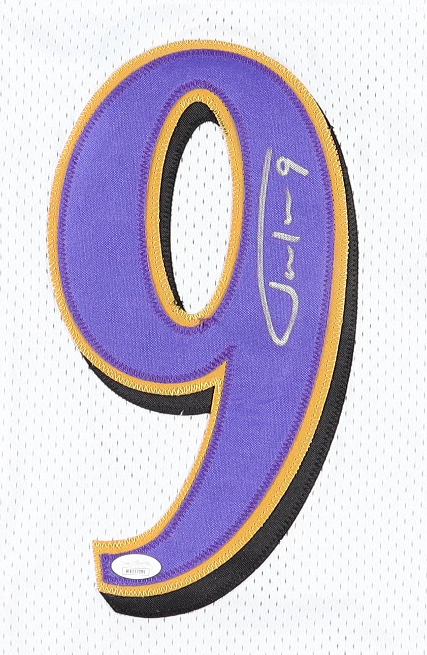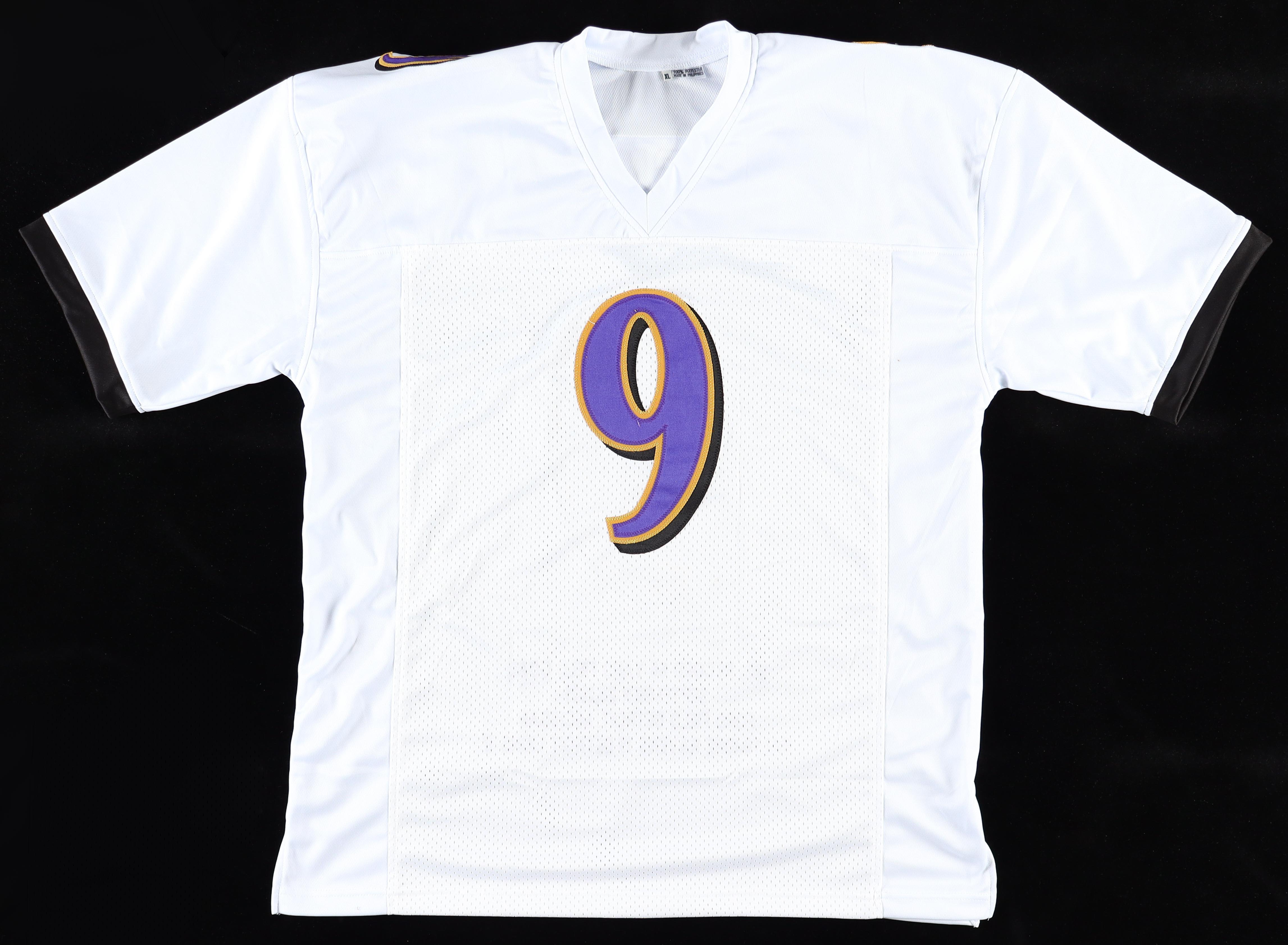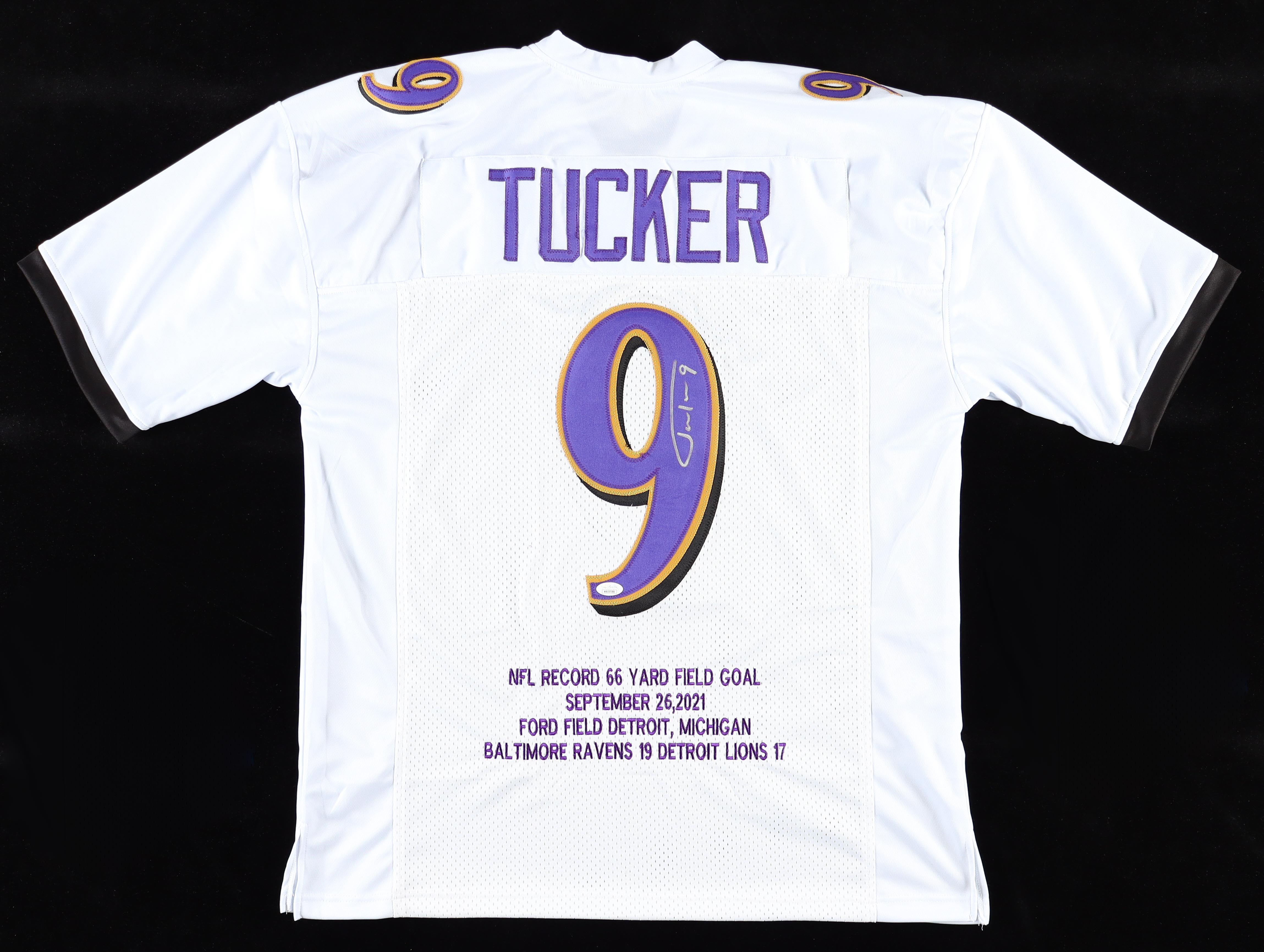 Custom style jersey. Everything is sewn on, size XL. Hand-signed by Justin Tucker. Tucker's career highlights have been custom stitched onto the back of the jersey below the reverse number.
