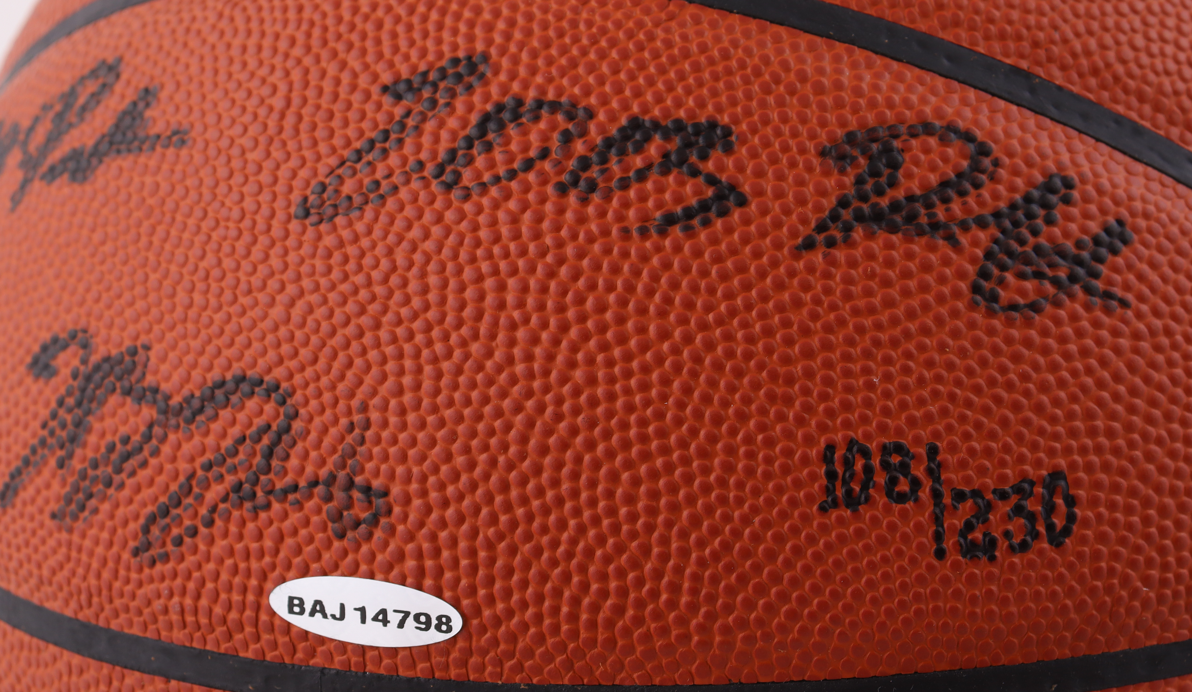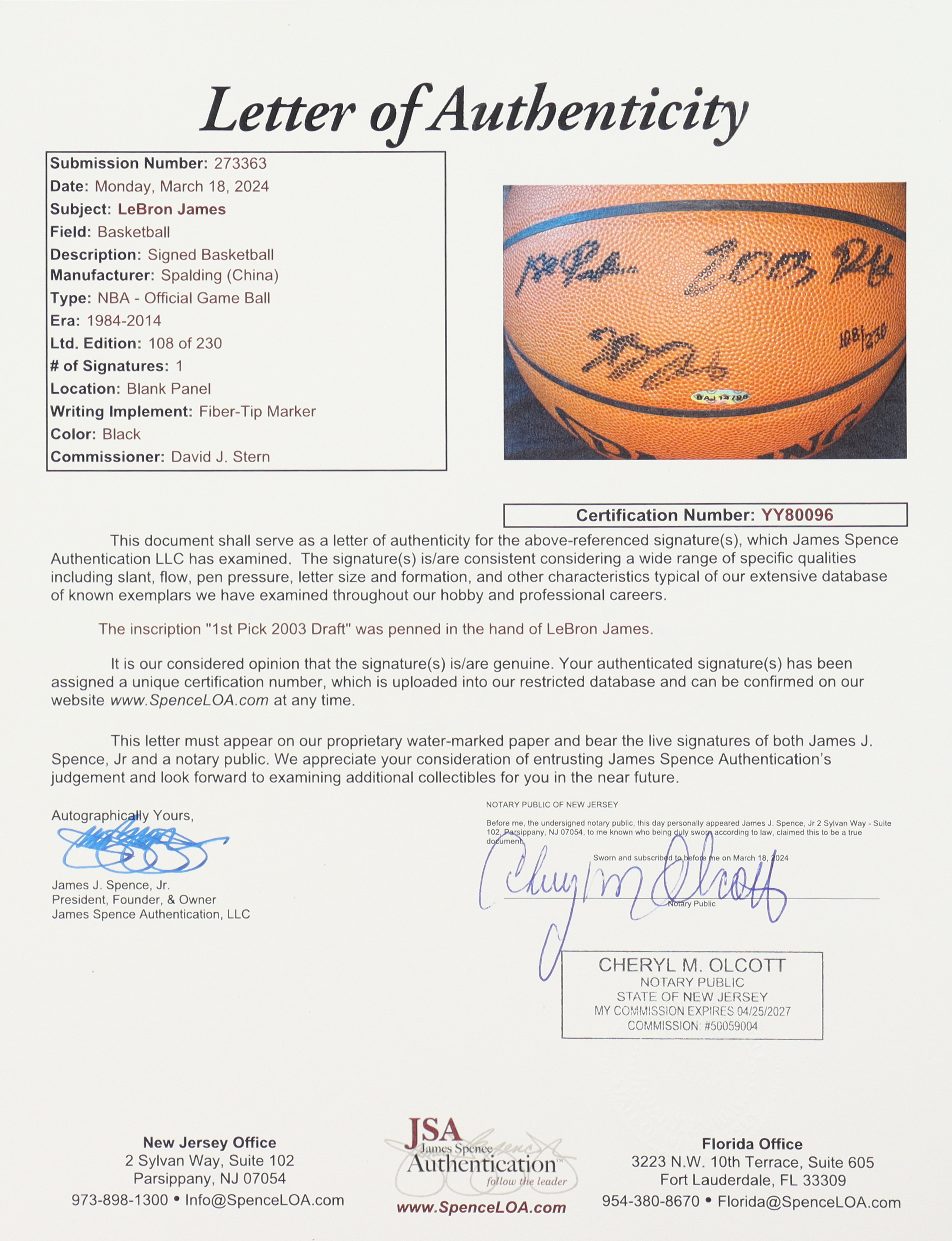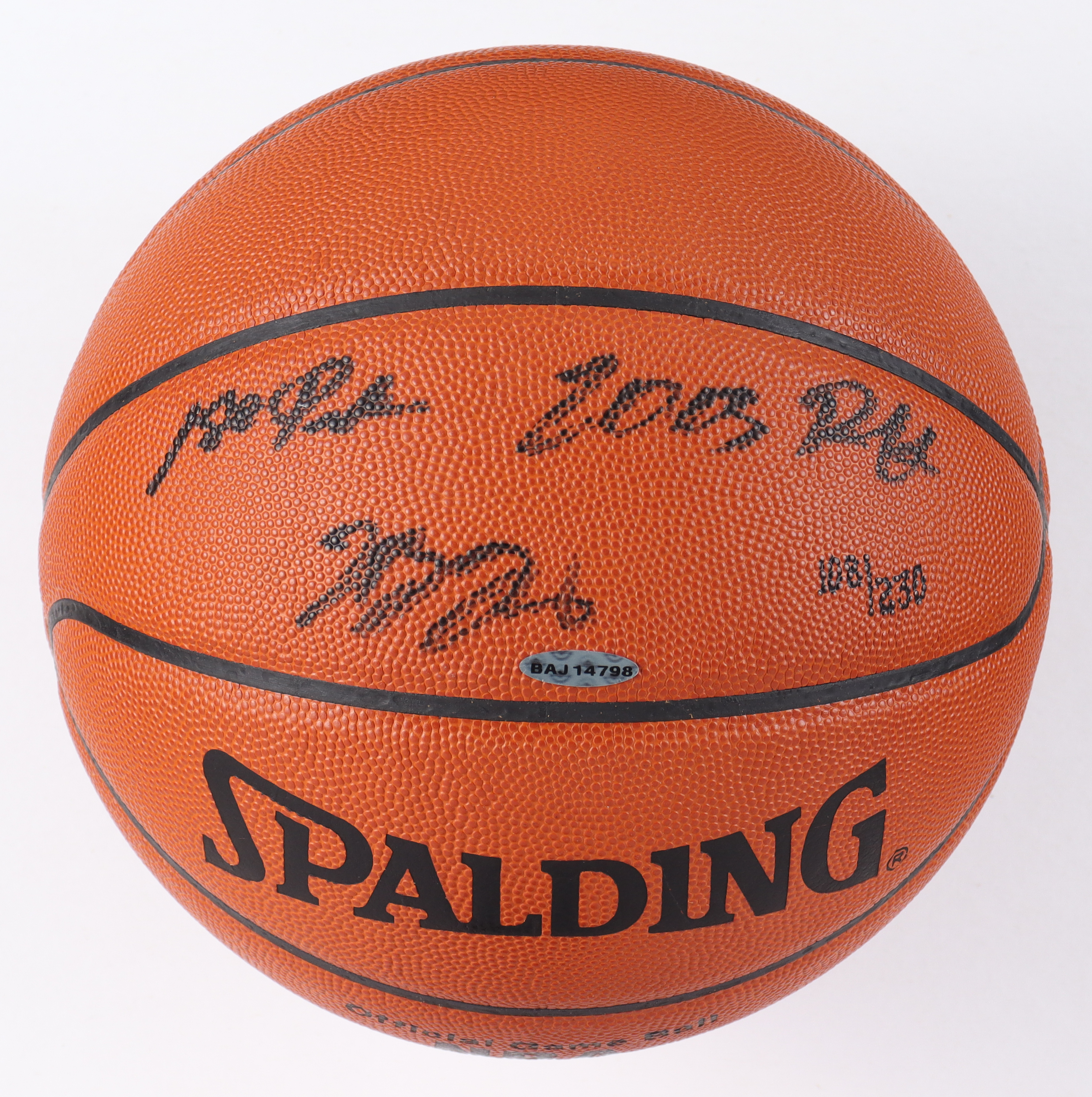 Spalding Official NBA basketball has been hand-signed and inscribed by NBA superstar, LeBron James! This basketball is limited edition and has been hand-numbered #108/230.