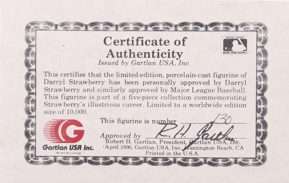 Gartlan ceramic figurine measures approximately 4.5" in height and features Darryl Strawberry (New York Mets). Figurine is limited edition and has been hand-numbered #/10,000. Includes original packaging. Please note, packaging shows some wear.