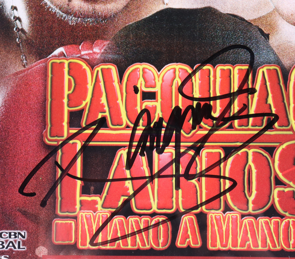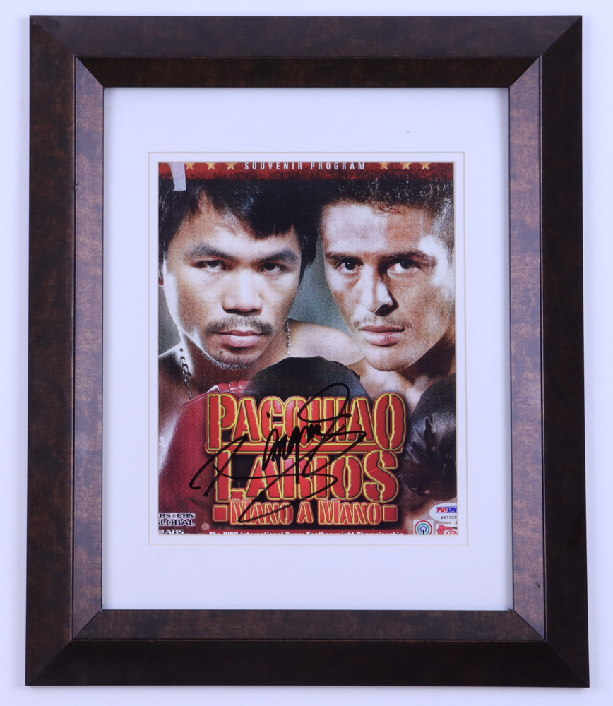 Custom framed photo measures approximately 14.5" x 17.5" in size and features a magazine page photo. Hand-signed by Manny Pacquiao. Please note, there are small dents on the left border of the frame.