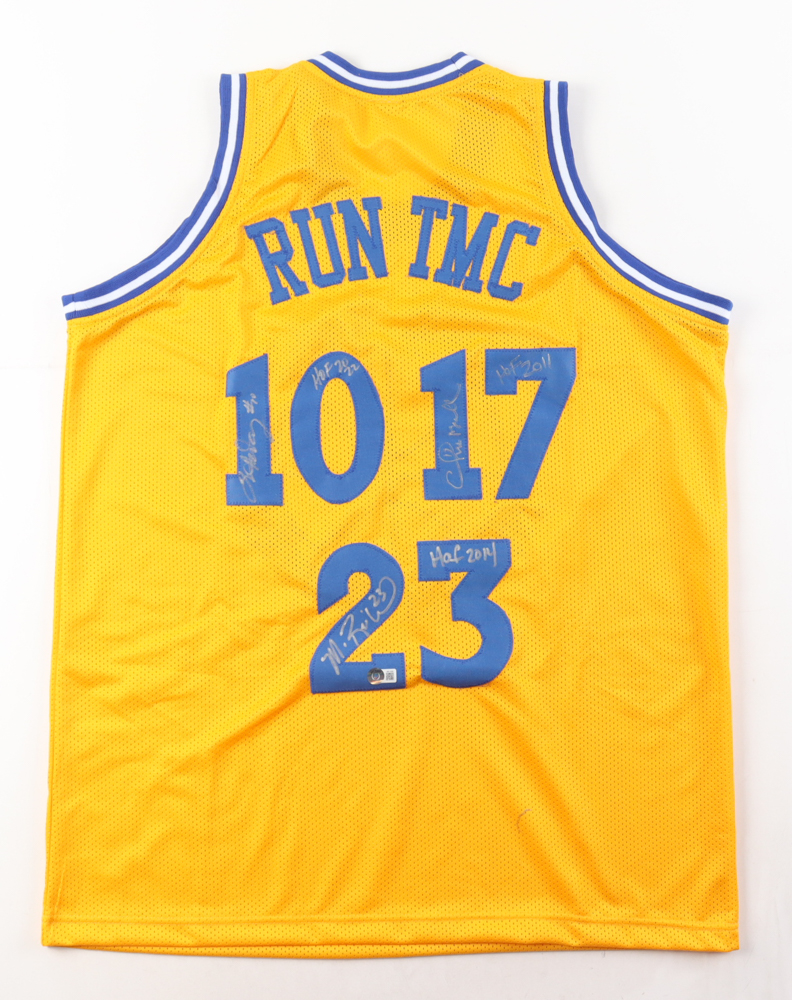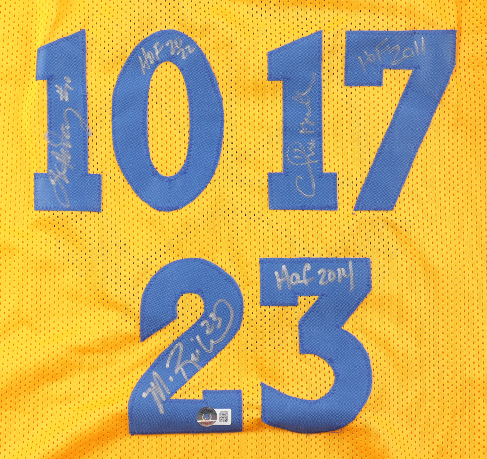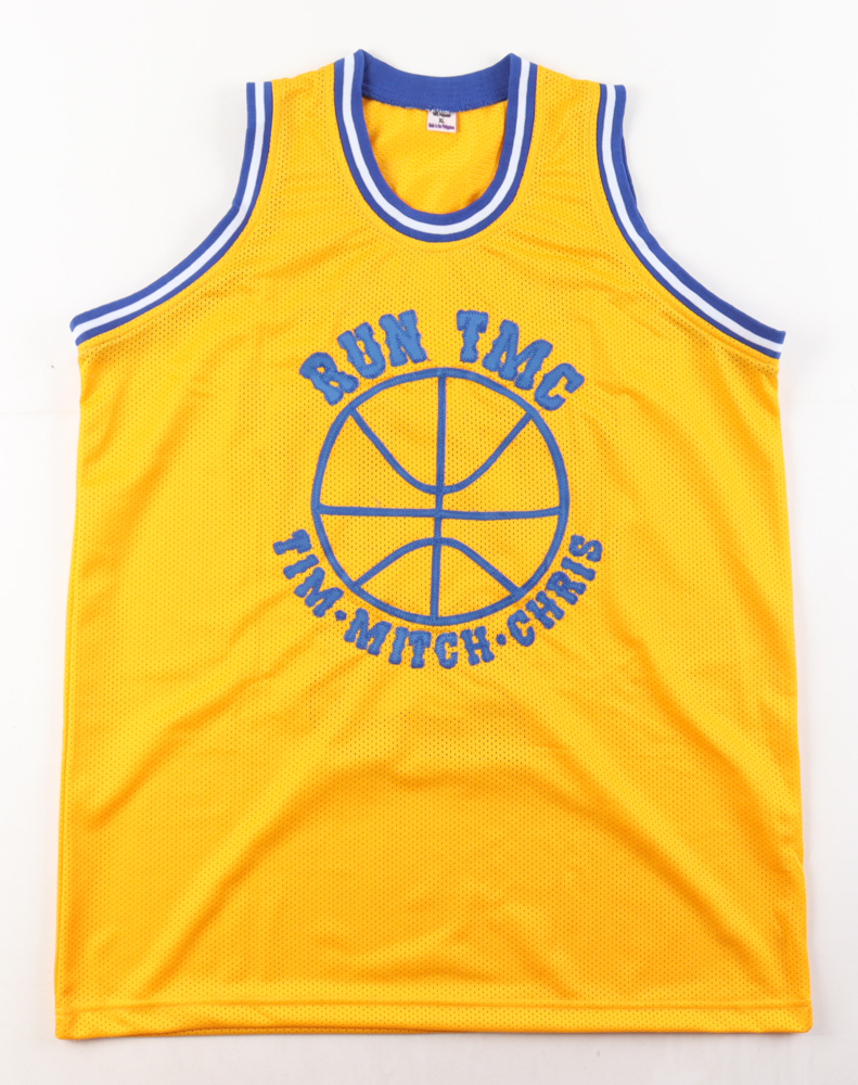 Custom jersey. Everything is sewn on, size XL. Hand-signed and inscribed by Tim Hardaway (HOF), Mitch Richmond (HOF), & Chris Mullin (HOF). Please note, there is a stray ink mark on the back of the jersey.