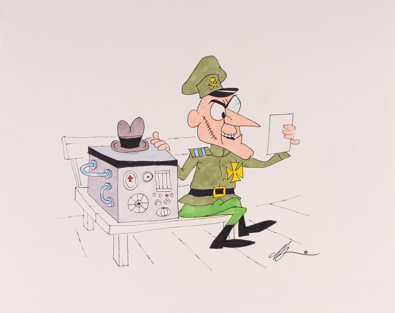 Rocky and Bullwinkle Fearless Leader Original Drawing Signed by Animator and Director Gerard Baldwin. Mr. Baldwin has written a description on the back of the drawing and assigned it a unique number. Drawing #214 – “Rocky and Bullwinkle’s Fearless Leader.”