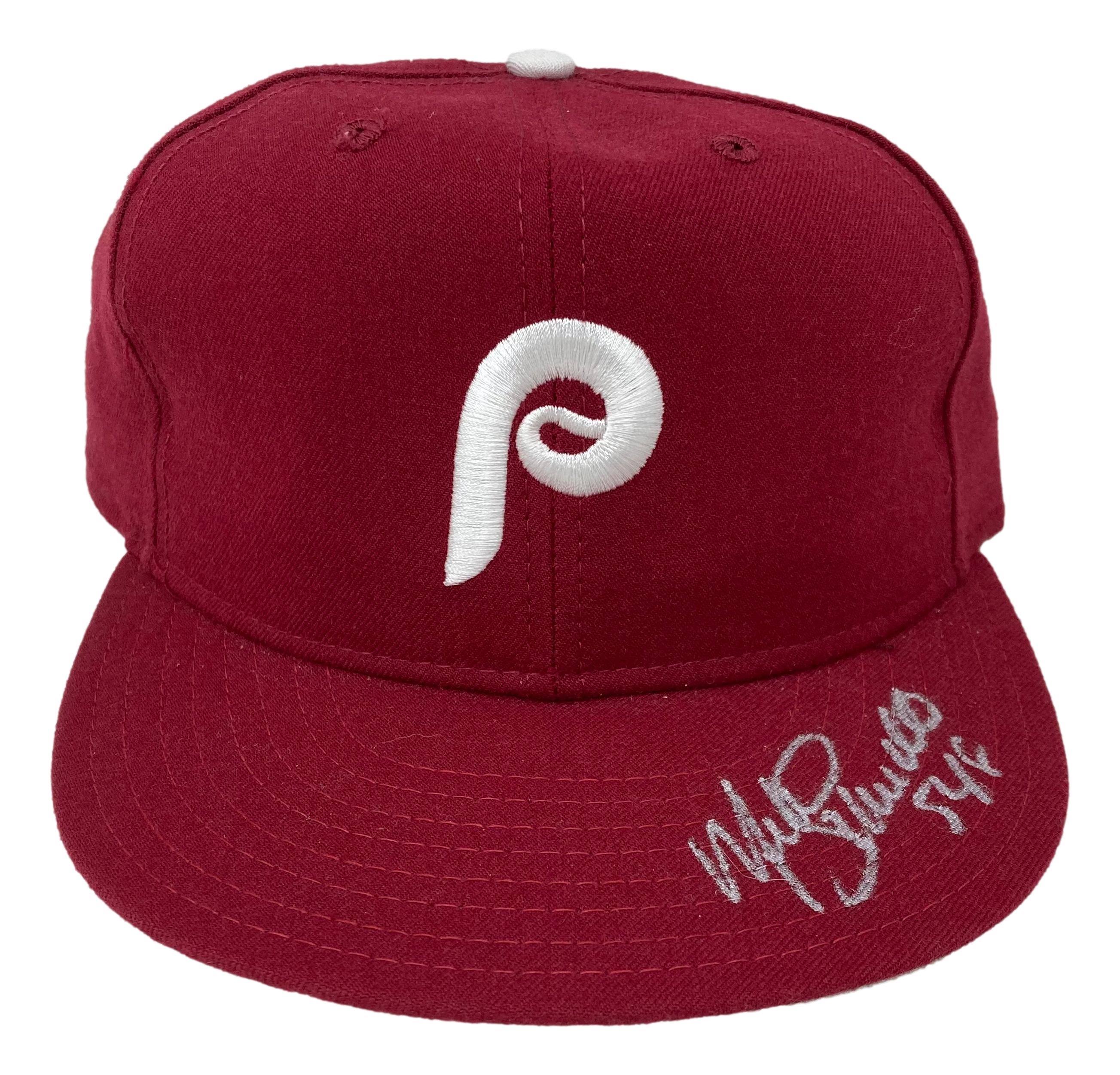 New Era Philadelphia Phillies baseball hat. Hand-signed and inscribed by Mike Schmidt (HOF).