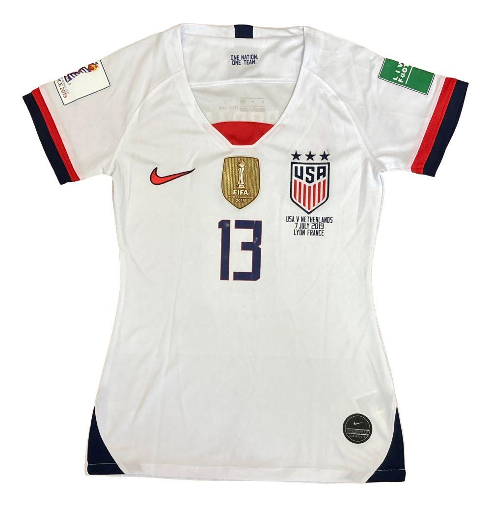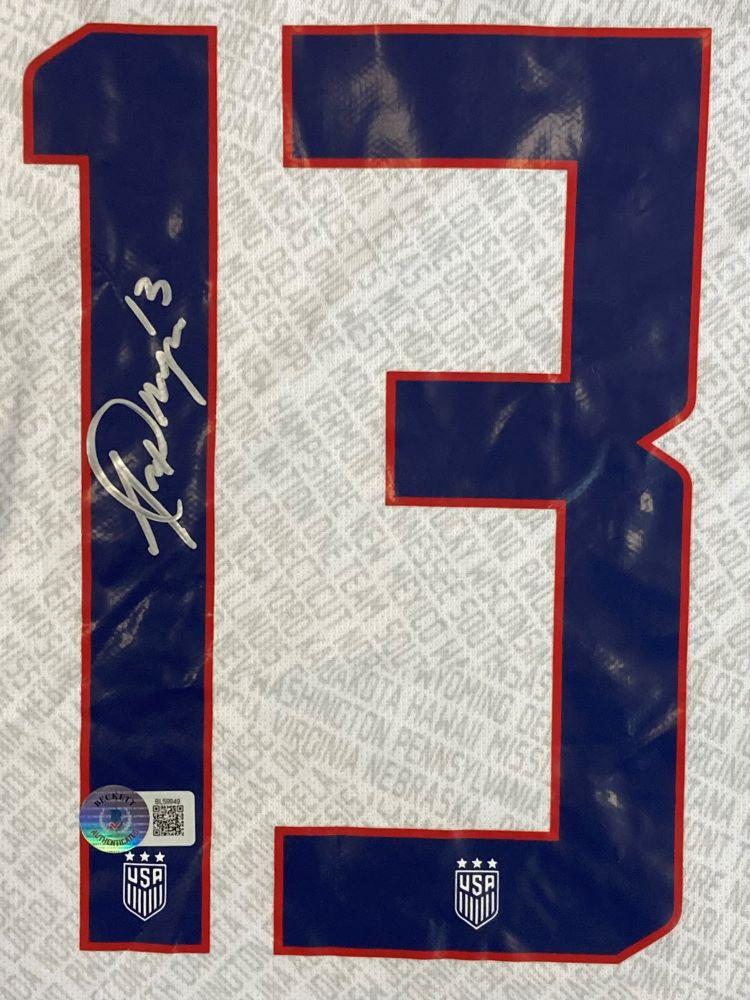 Nike jersey with everything pressed on, size S. Hand-signed by Alex Morgan.