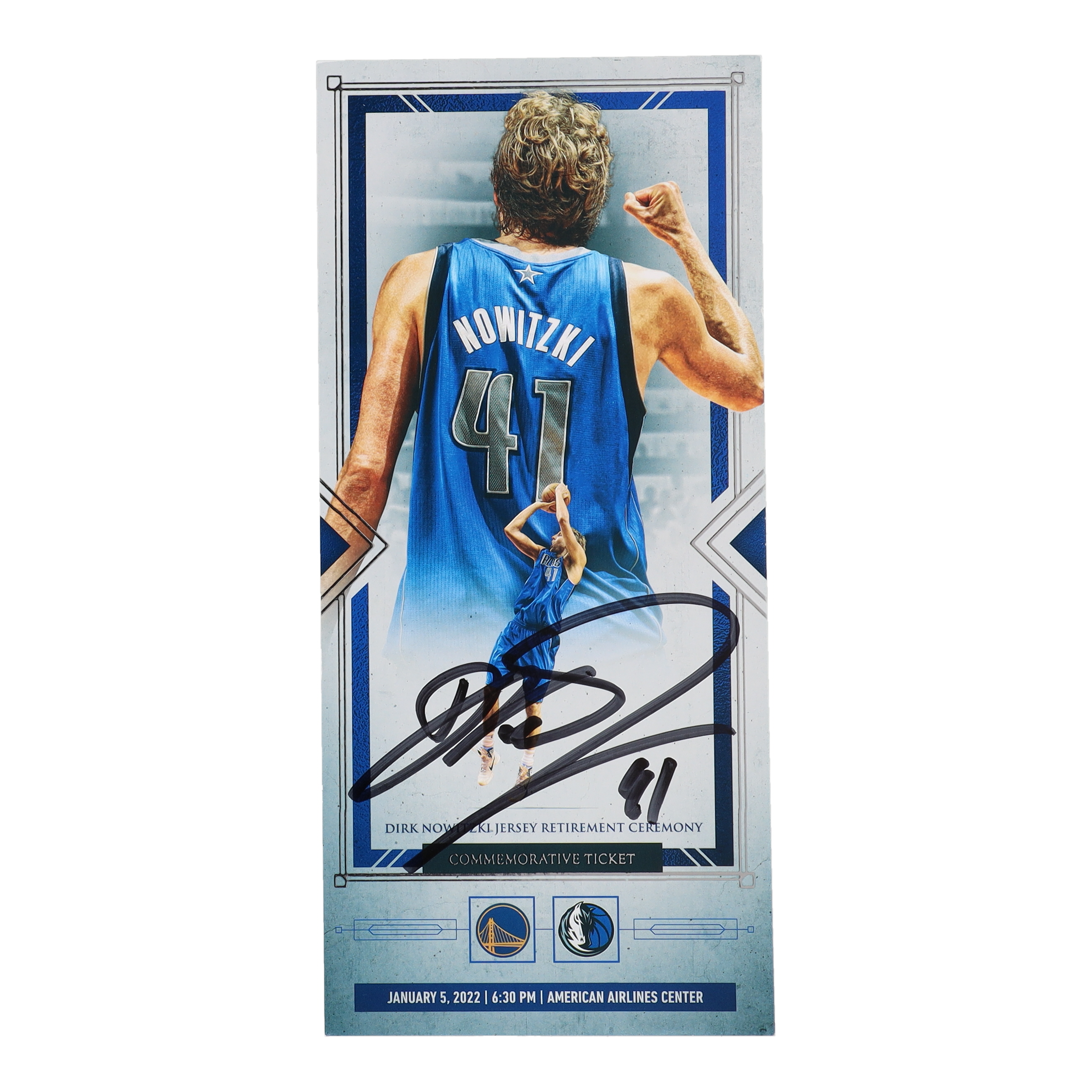 Ticket is dated January 5, 2022. Hand-signed by Dirk Nowitzki (Dallas Mavericks, HOF).