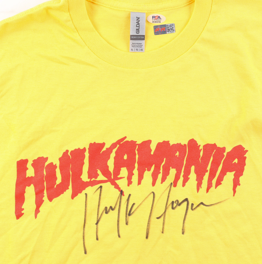 Hulkamania T-shirt with everything printed on, size XL. Hand-signed by Hulk Hogan (HOF).