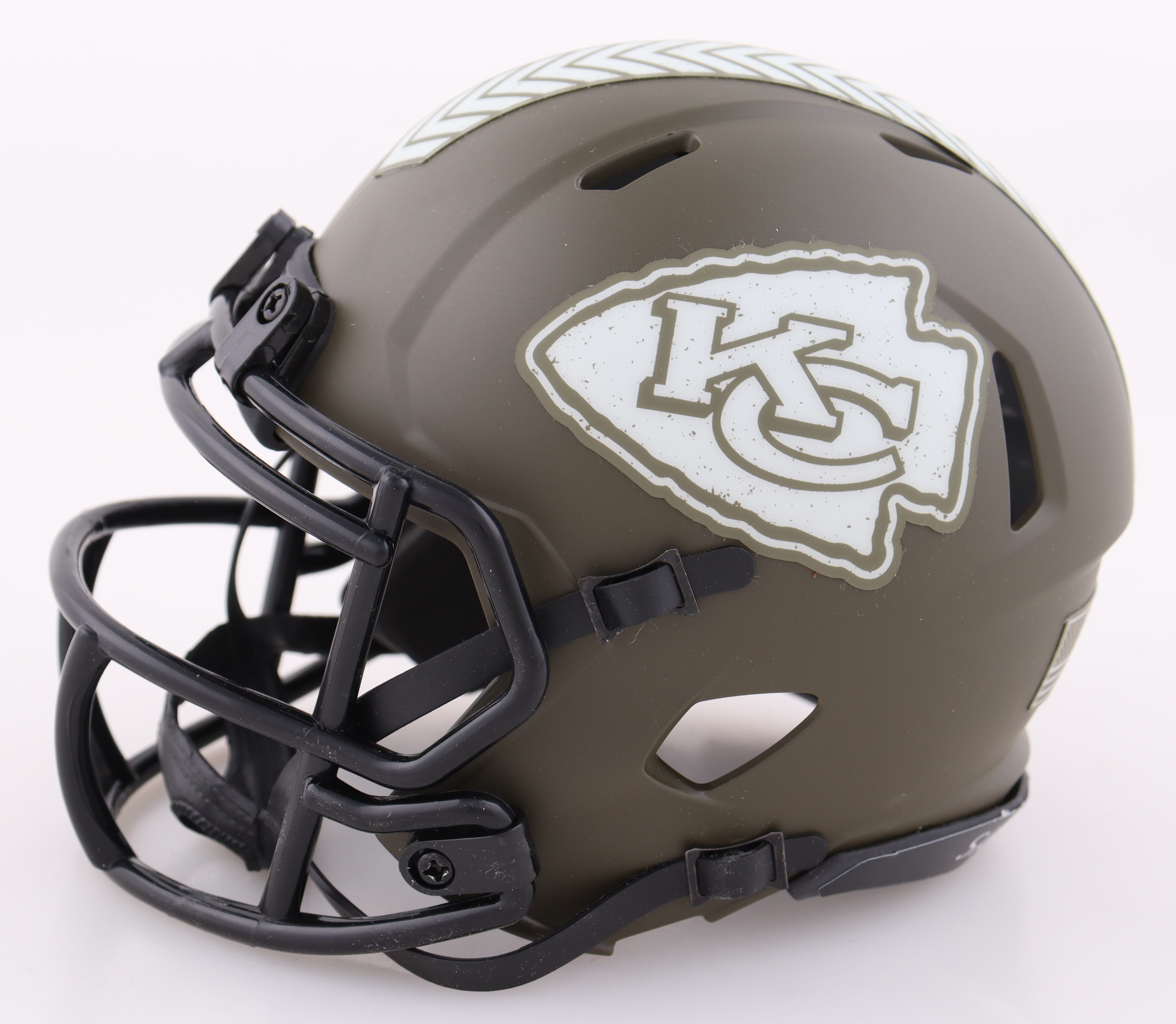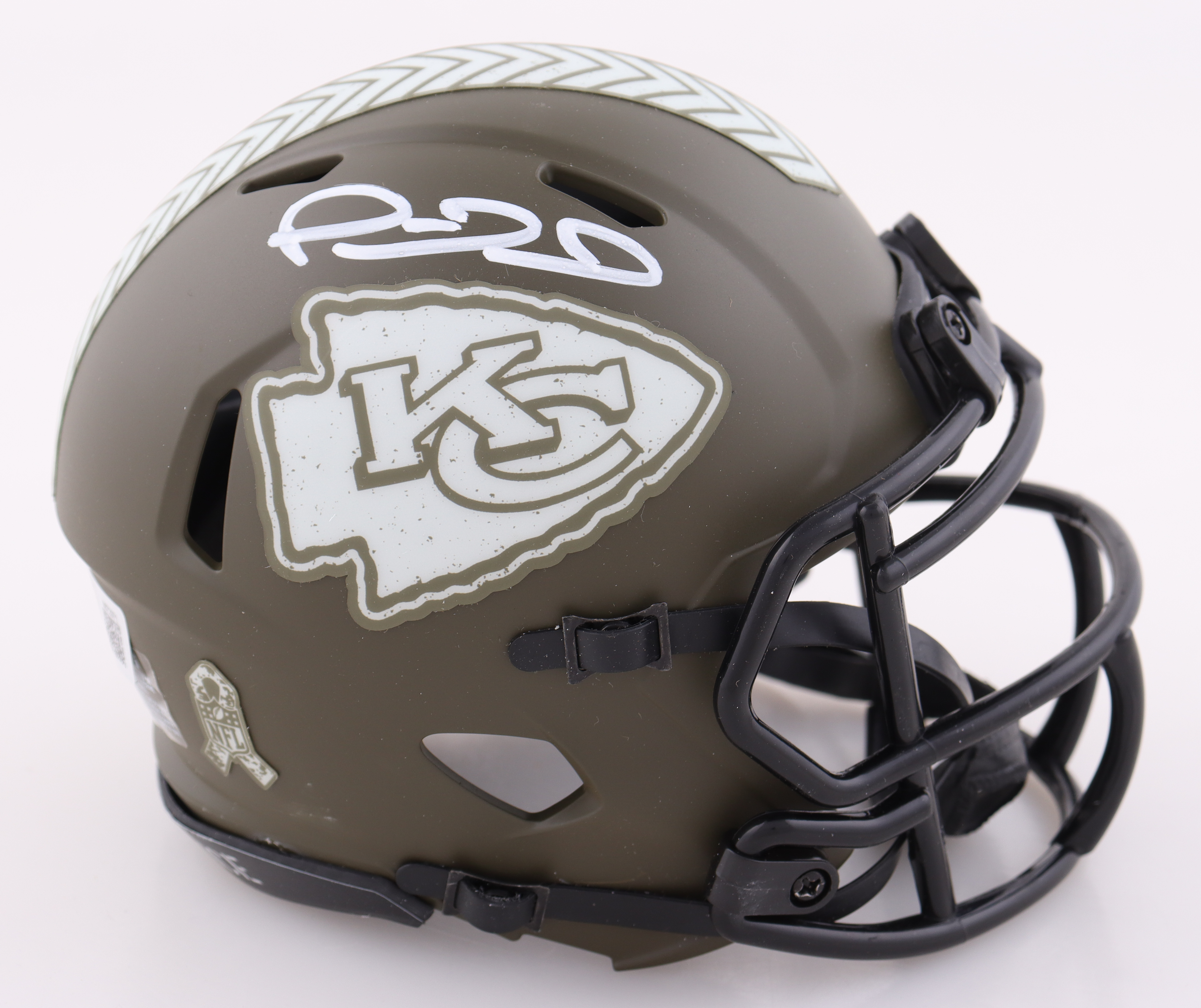 Riddell Kansas City Chiefs salute to service alternate speed mini helmet. Hand-signed by Patrick Mahomes.