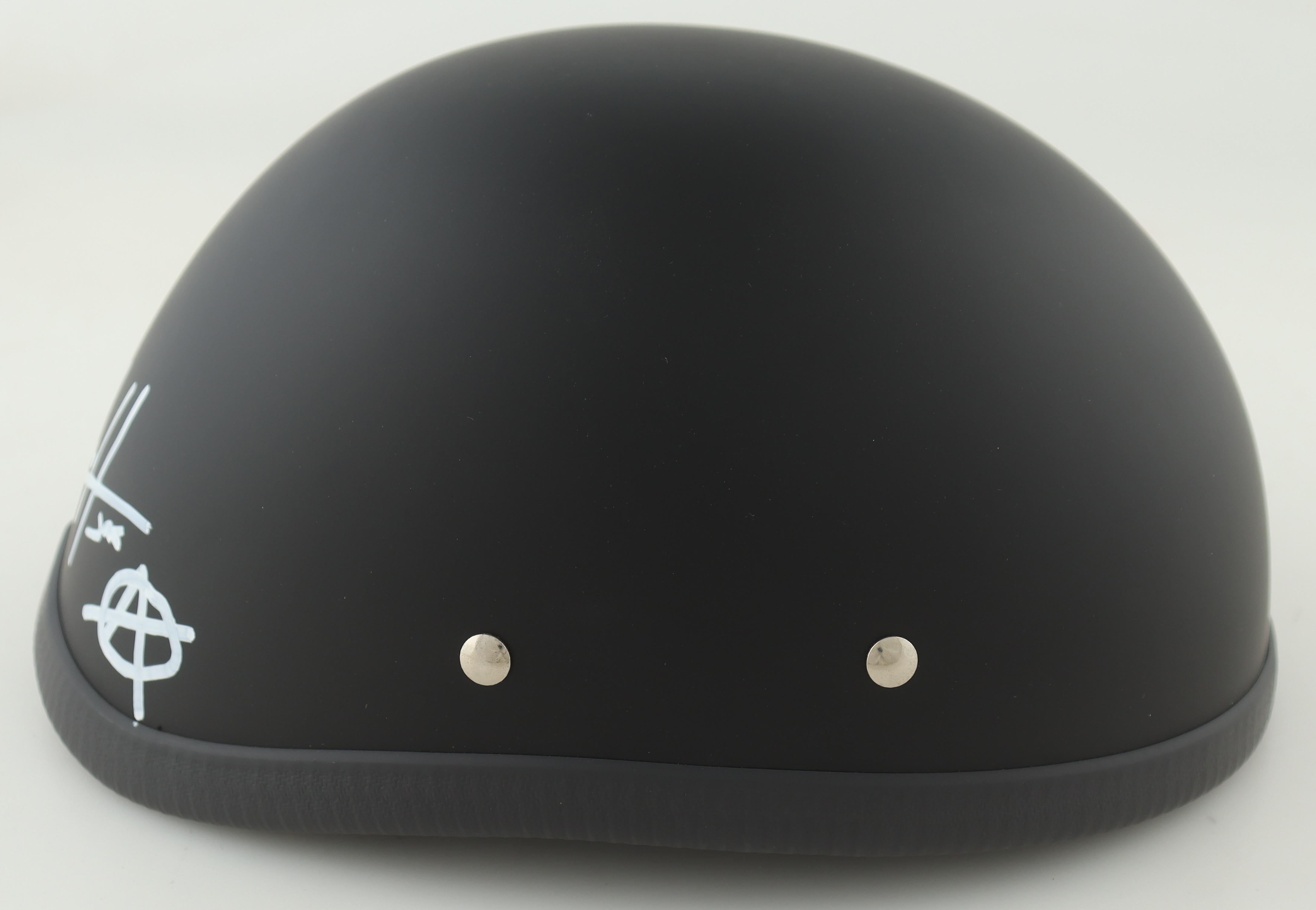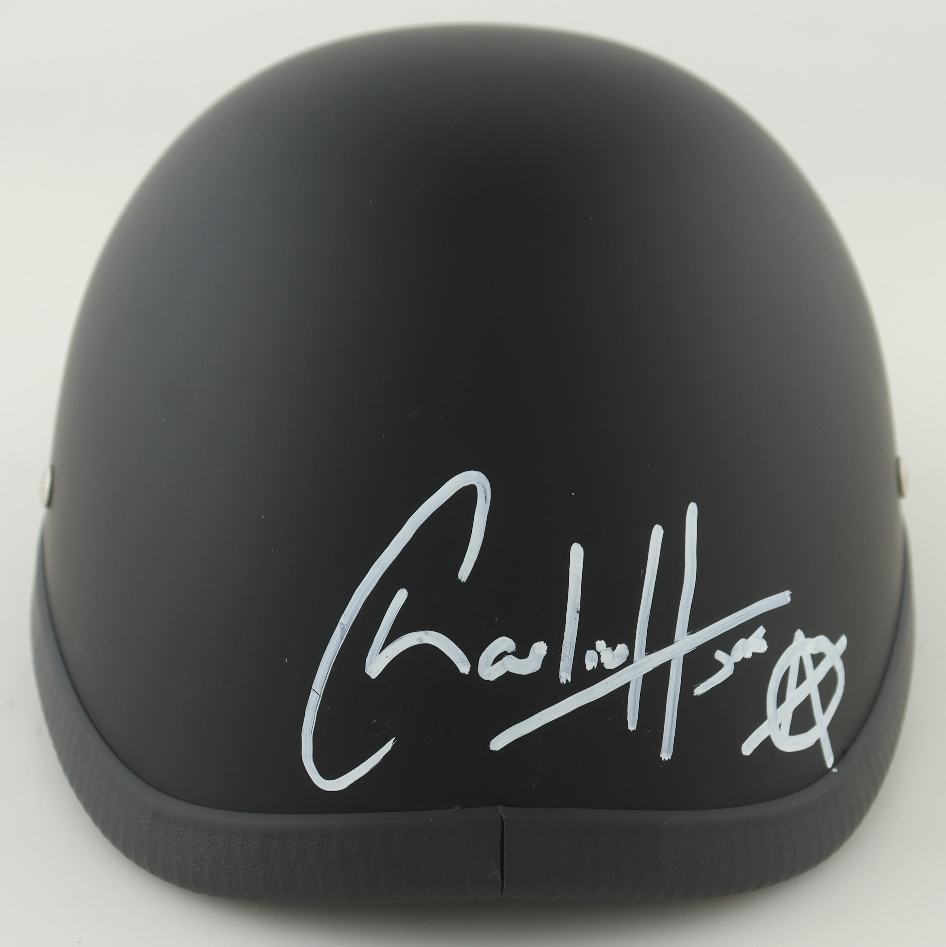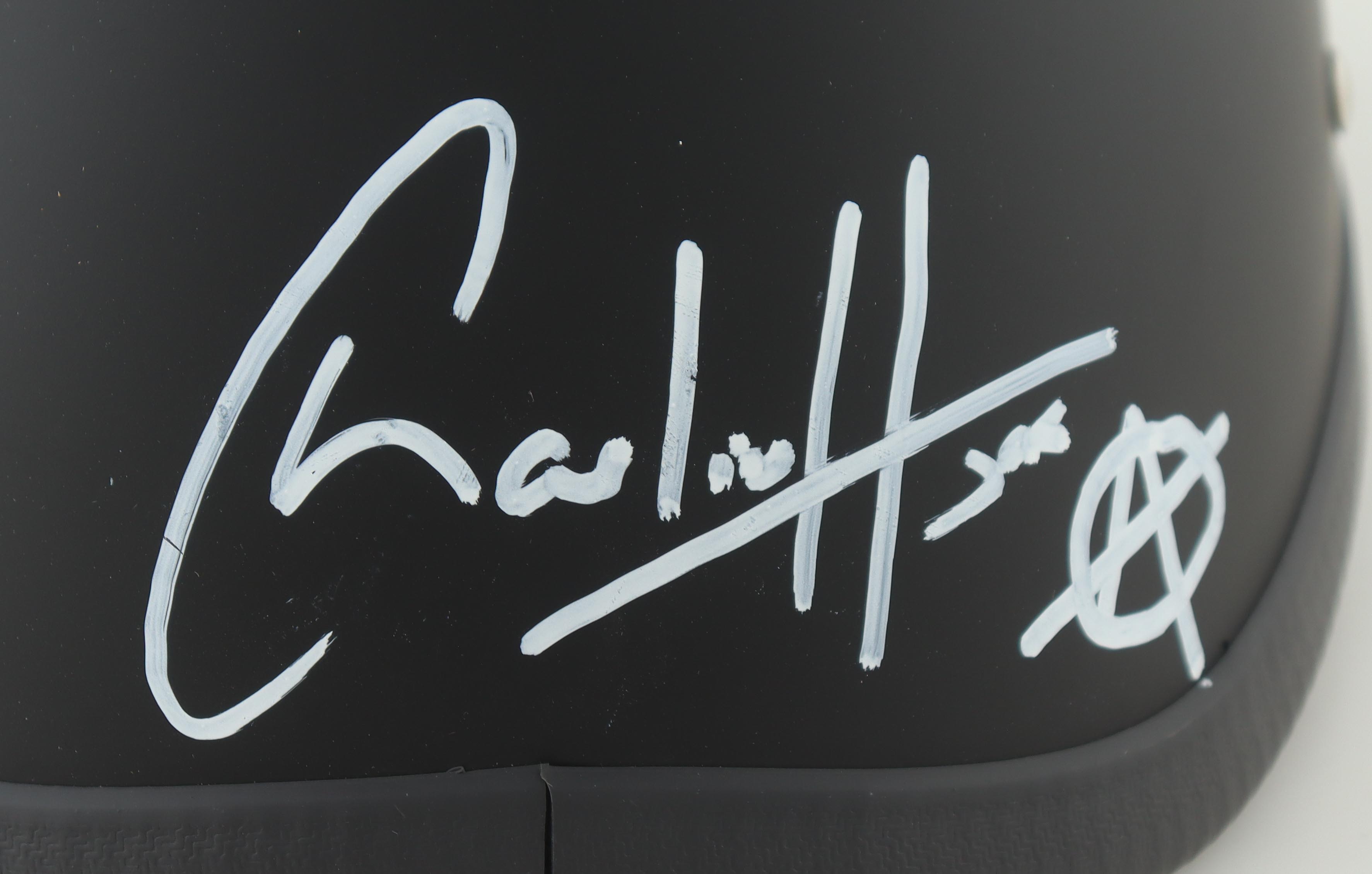 Daytona biker helmet has been hand-signed and inscribed by Charlie Hunnam (Jax Teller). Includes hand-drawn sketch of anarchist symbol. Please note, there is slight scuffing on the helmet.
