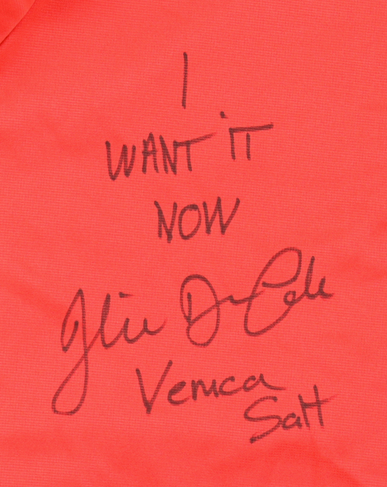 Custom dress is size M and has been hand-signed and inscribed by Julie Dawn Cole (Veruca Salt).