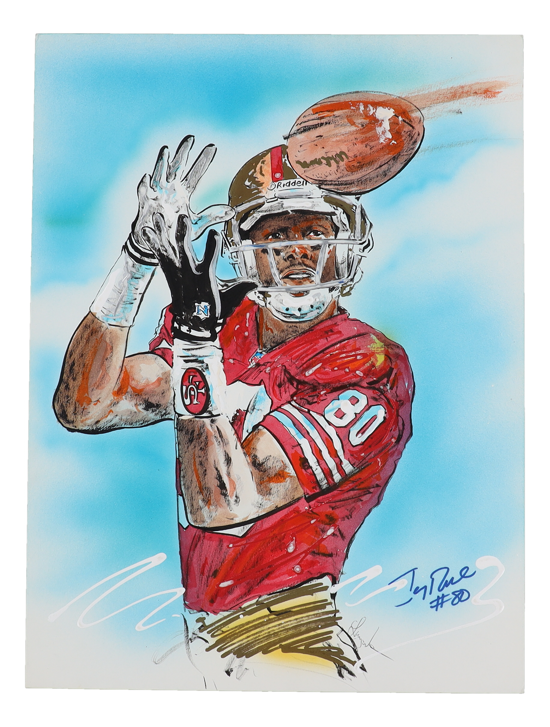 Lithograph measures 15" x 20" in size. Hand-signed by Jerry Rice (San Francisco 49ers, HOF) and artist, Gary Longordo.