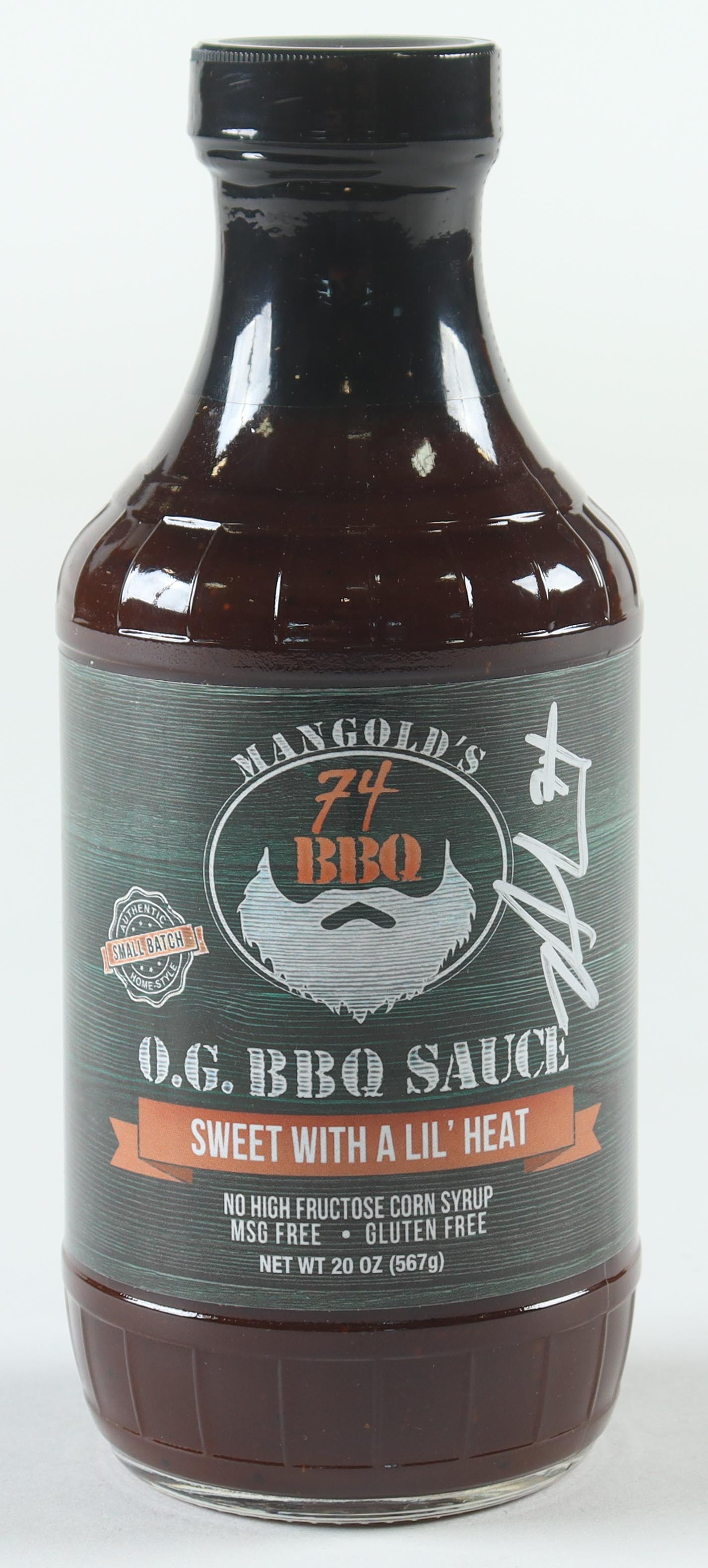Mangold's 74 BBQ OG BBQ sauce Sweet with a lil' heat bottle has been hand-signed by Nick Mangold.
