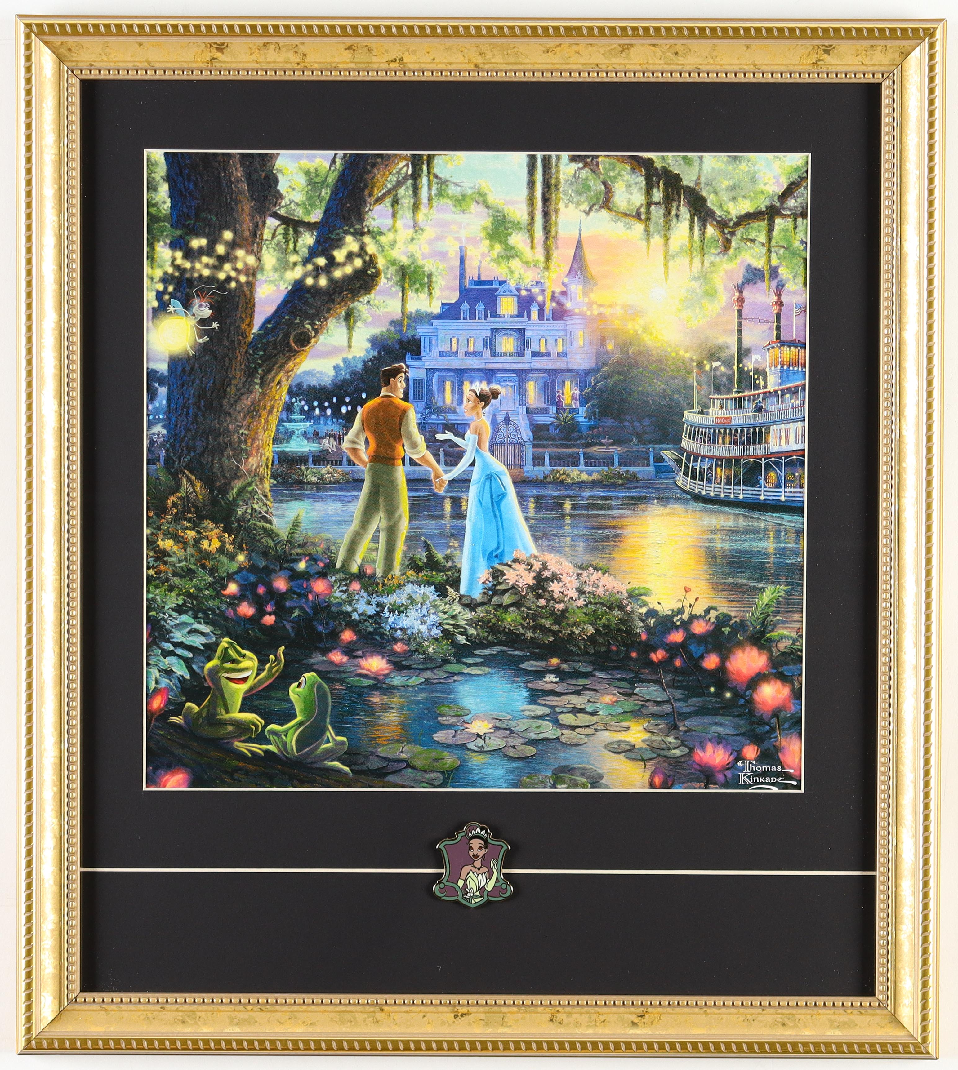 Thomas Kinkade "The Princess and the Frog" Custom Framed Print Display with Princess Tiana Disney Pin