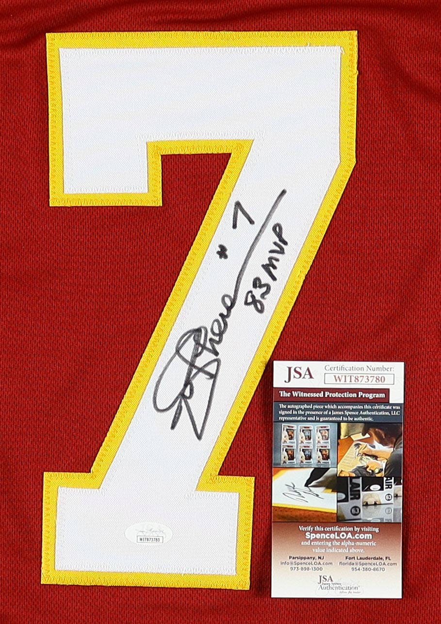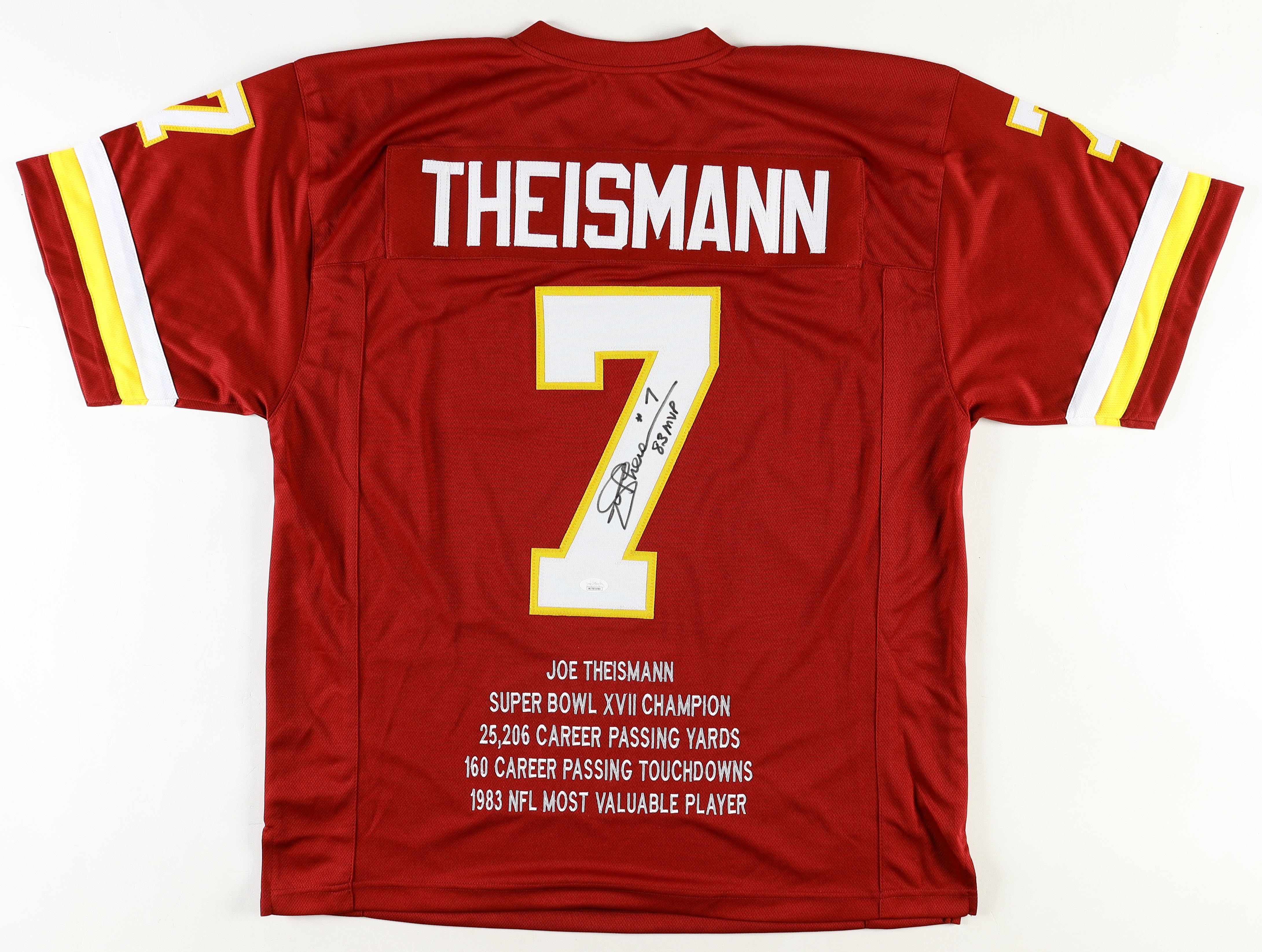 Joe Theismann Signed Career Highlight Stat Jersey Inscribed "83 MVP" (JSA)