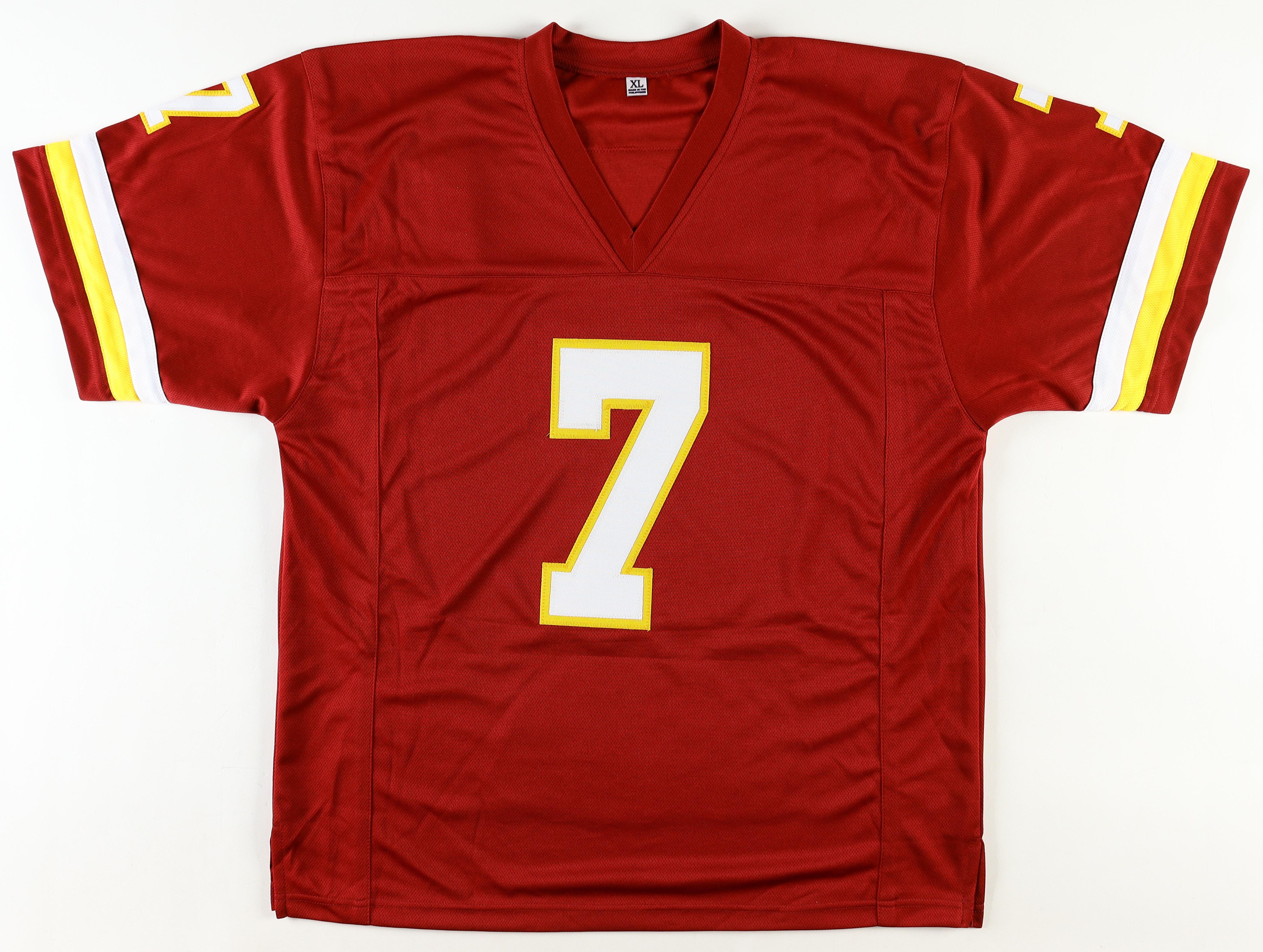Custom jersey. Everything is sewn on, size XL. Hand-signed and inscribed by Joe Theismann. Theismann's career highlights have been custom stitched onto the back of the jersey below the reverse number.