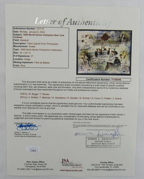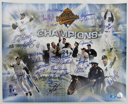 Poster measures 16" x 20" in size and has been hand-signed by (27) with Wade Boggs (HOF), Tim Raines (HOF), Andy Pettitte, Dwight Gooden, Darryl Strawberry, David Cone, Cecil Fielder, Mel Stottlemyre, Graeme Lloyd, Tony Cloninger, Don Zimmer, Chris Chambliss, Charlie Hayes, Tino Martinez, Jimmy Key, Mike Aldrete, John Wetteland, Ruben Sierra, Joe Girardi, Steve Howe, Mariano Duncan, Jeff Nelson, Andy Fox, Jim Leyritz, Brian Boehringer, Wally Whitehurst and Dave Pavlas.