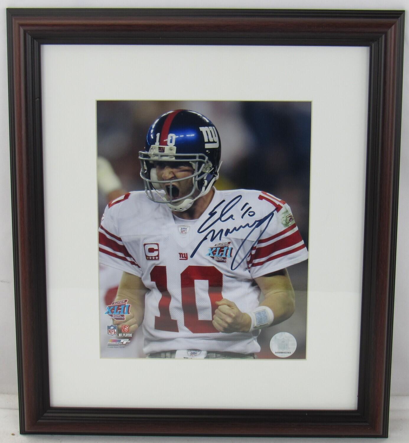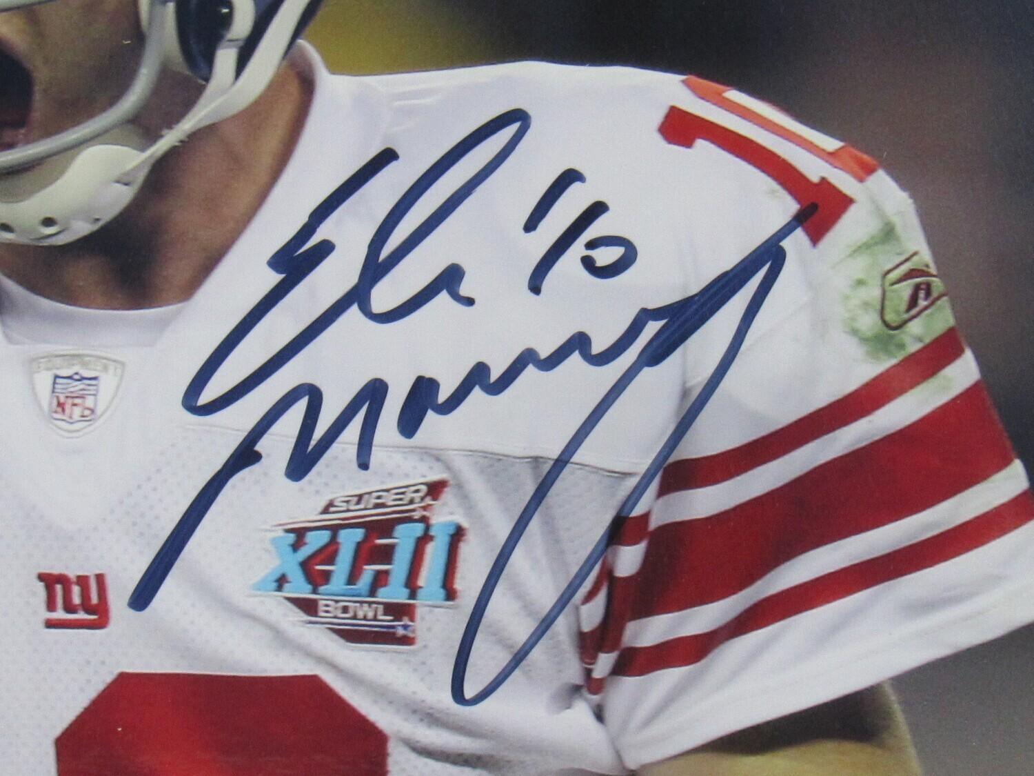 Custom frame measures 14" x 16" and features an 8" x 10" photo hand-signed by Eli Manning (New York Giants).