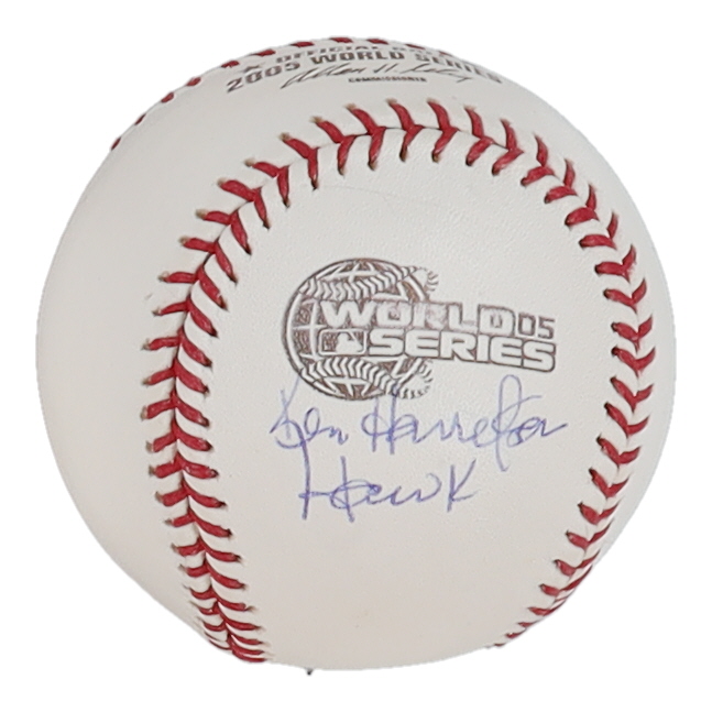 Rawlings Official 2005 World Series Logo baseball. Hand-signed by Ken "Hawk" Harrelson (Oakland Athletics). Please note, the baseball is naturally toning.