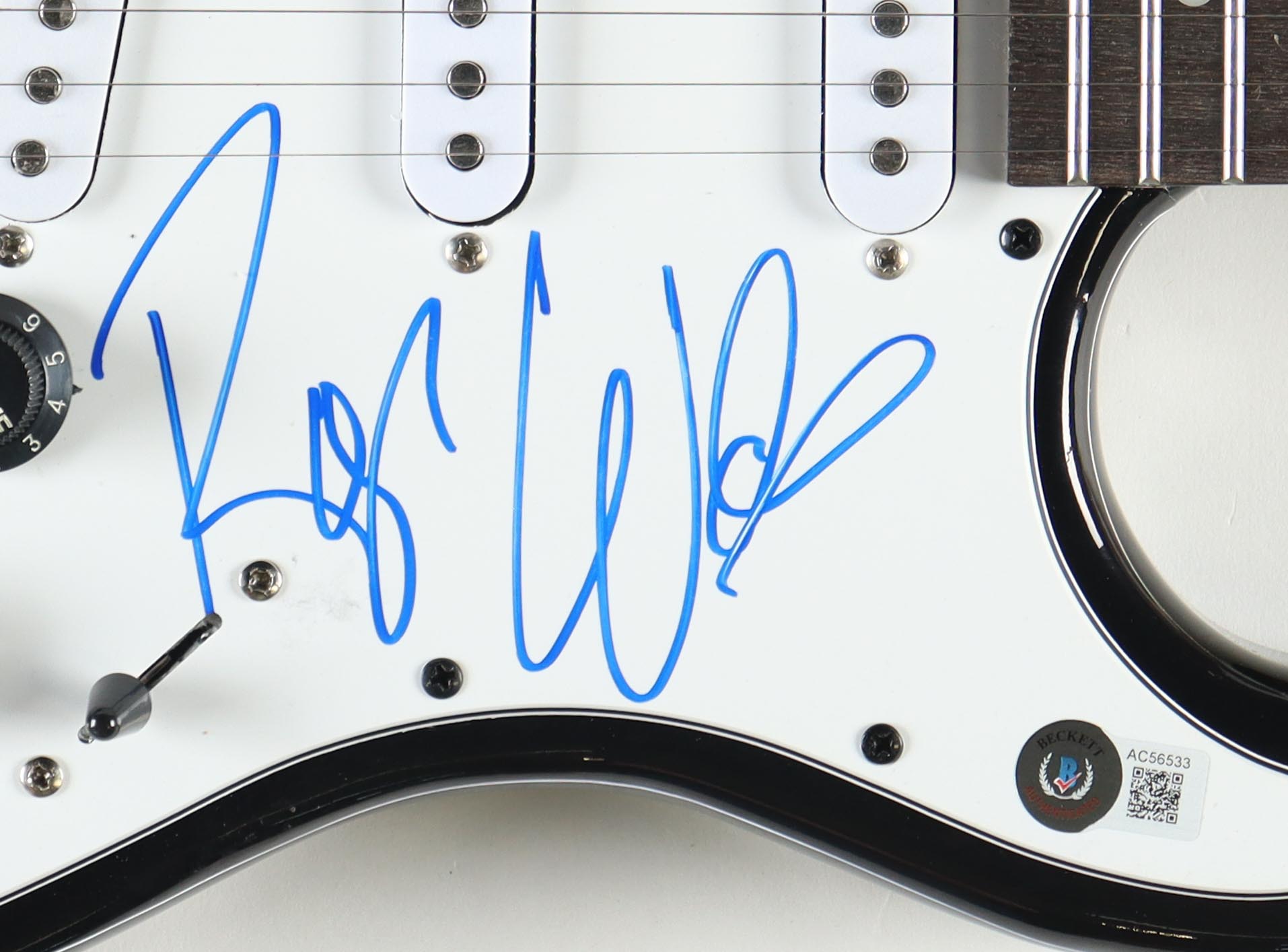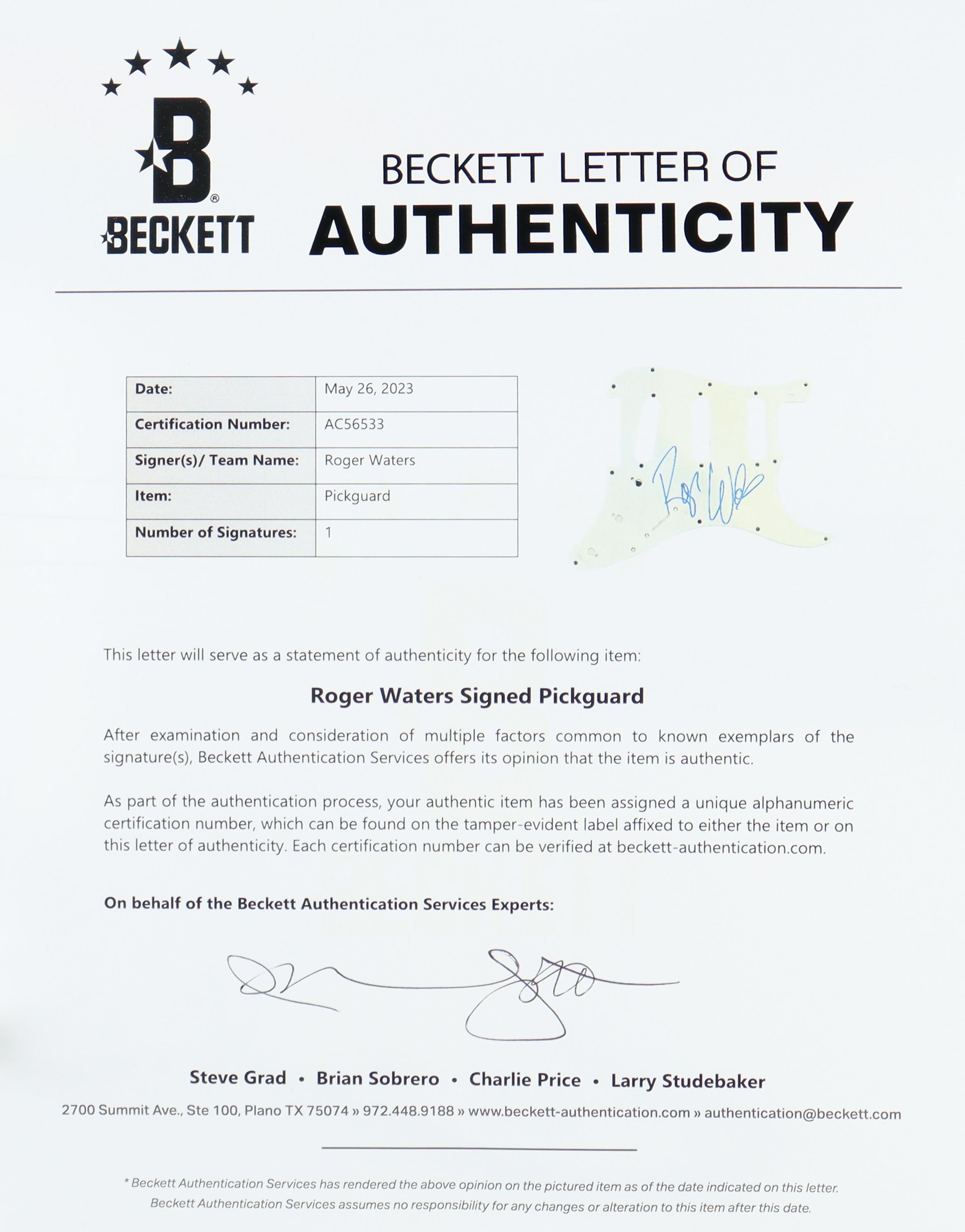 Full-size customized Lyx electric guitar measures approximately 39" in length and has been hand-signed on the pickguard by Roger Waters.