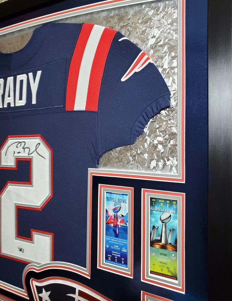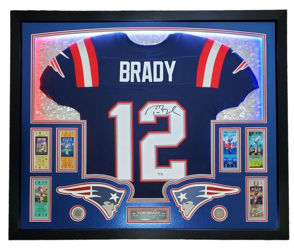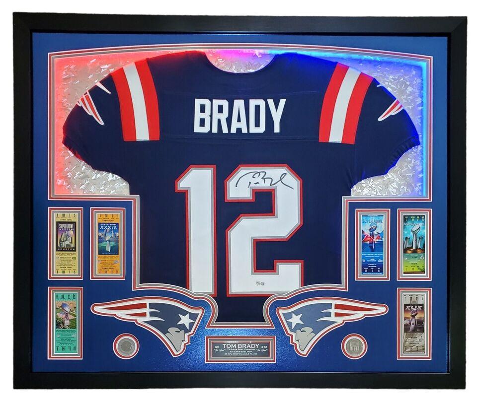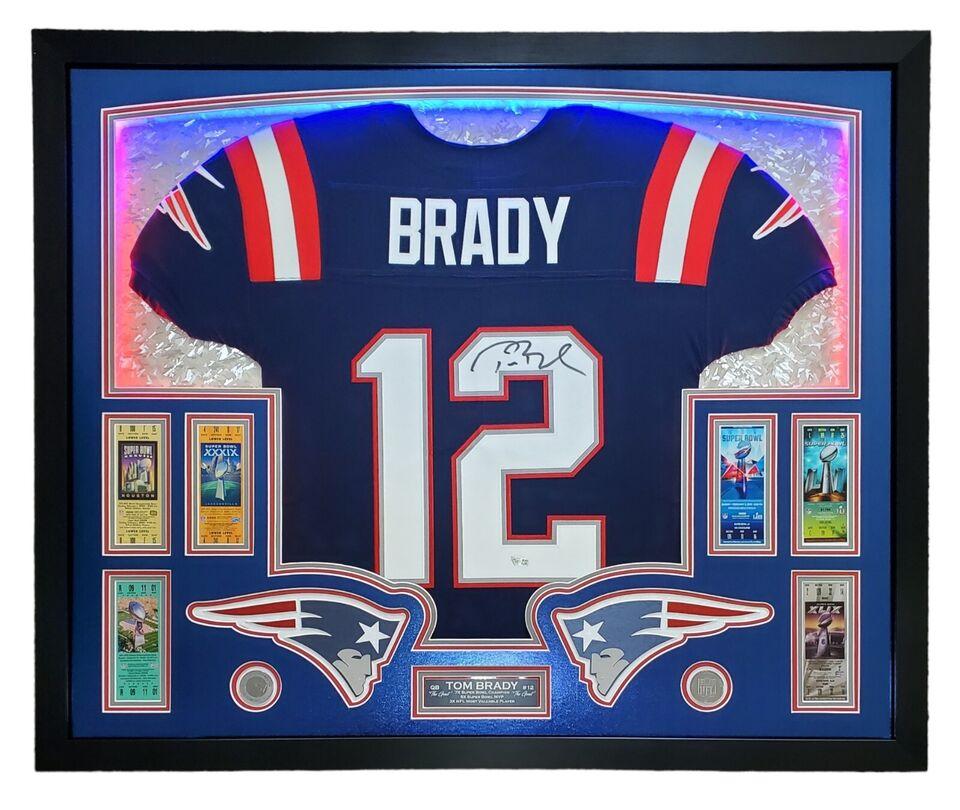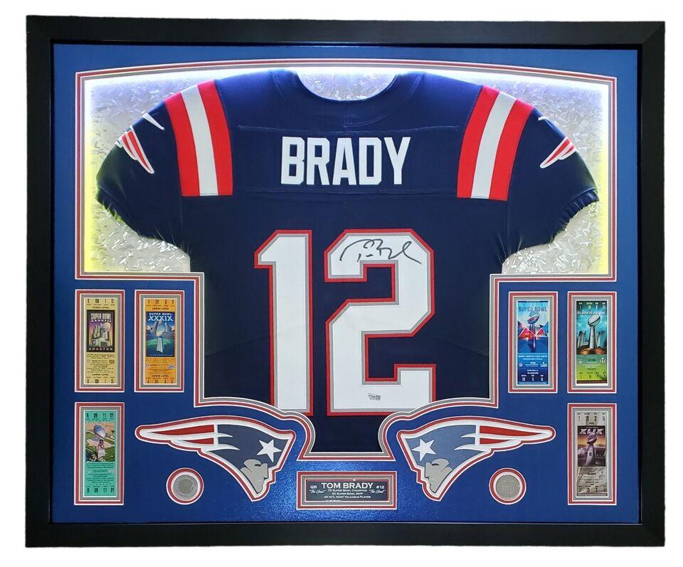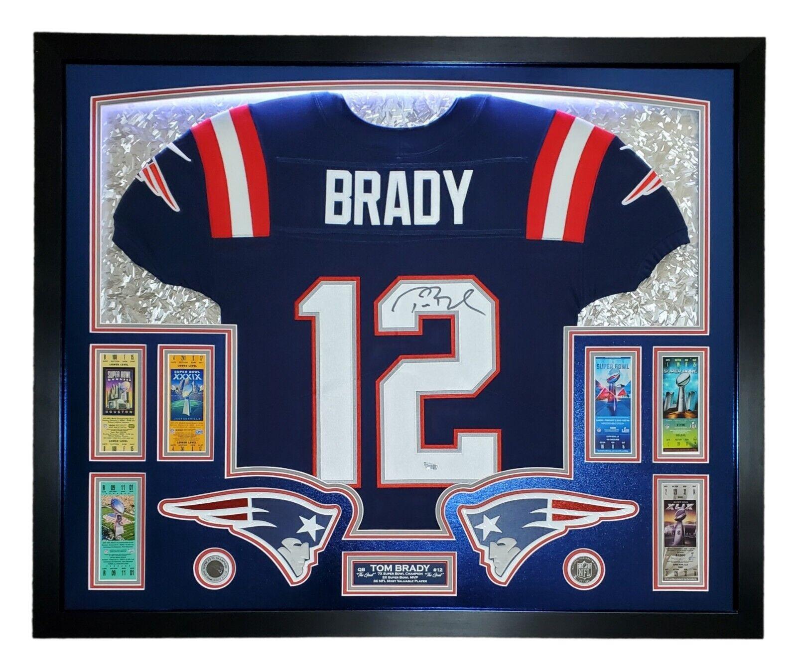 Tom Brady Signed Patriots Custom Framed LED Backlit Nike Elite Jersey Display with (6) Replica Super Bowl Tickets (Fanatics)