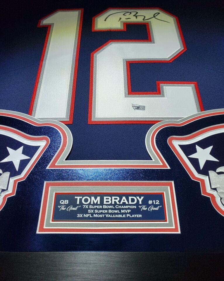 Custom frame measures 33" x 42" in size and comes installed with customizable LED backlighting. The frame features a Nike elite vapor jersey that has been hand-signed by Tom Brady (New England Patriots).