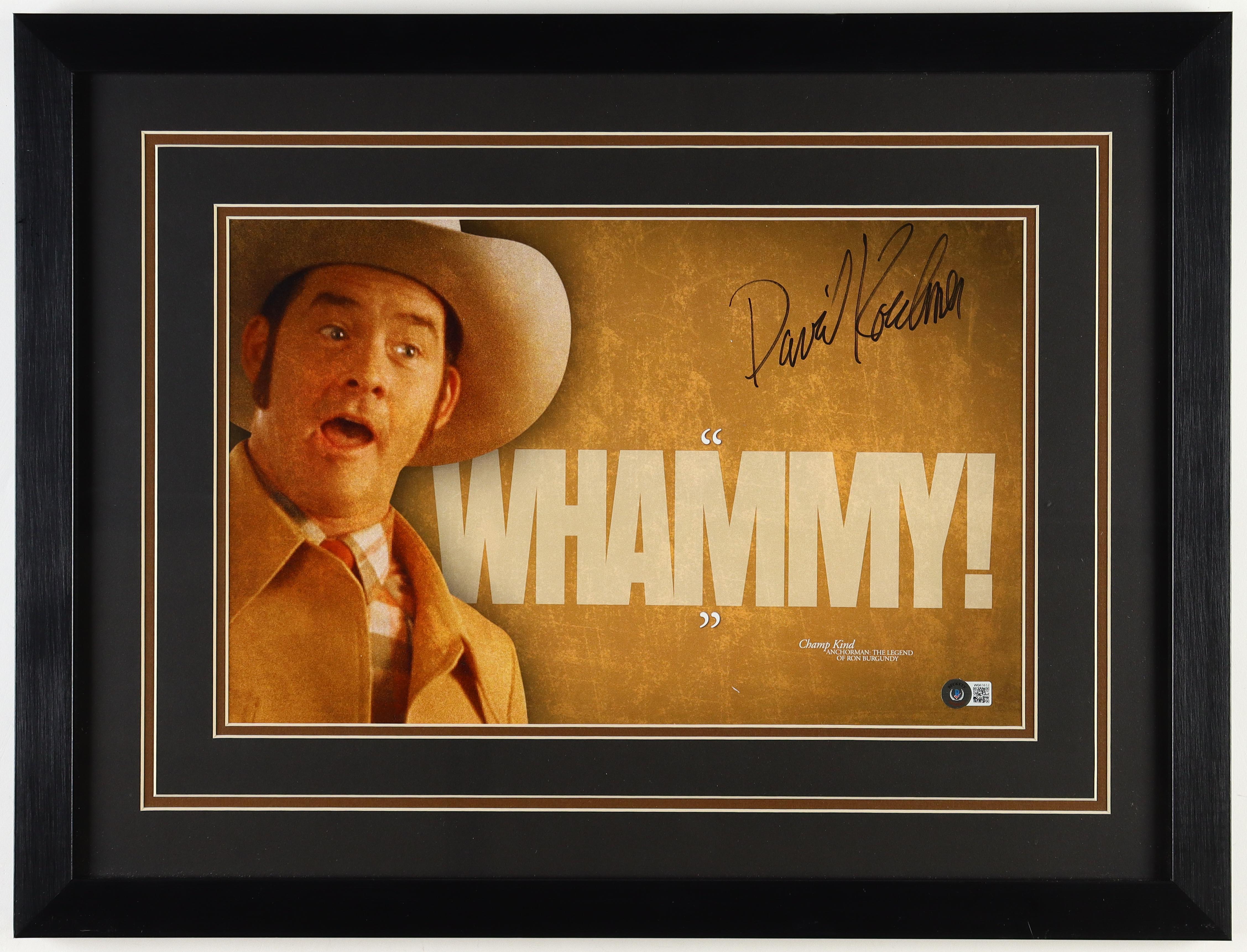 Custom frame measures approximately 19" x 25" in size and features a photo that has been hand-signed by David Koechner (Champion "Champ" Kind). Please note, there is some scuffing on the display.