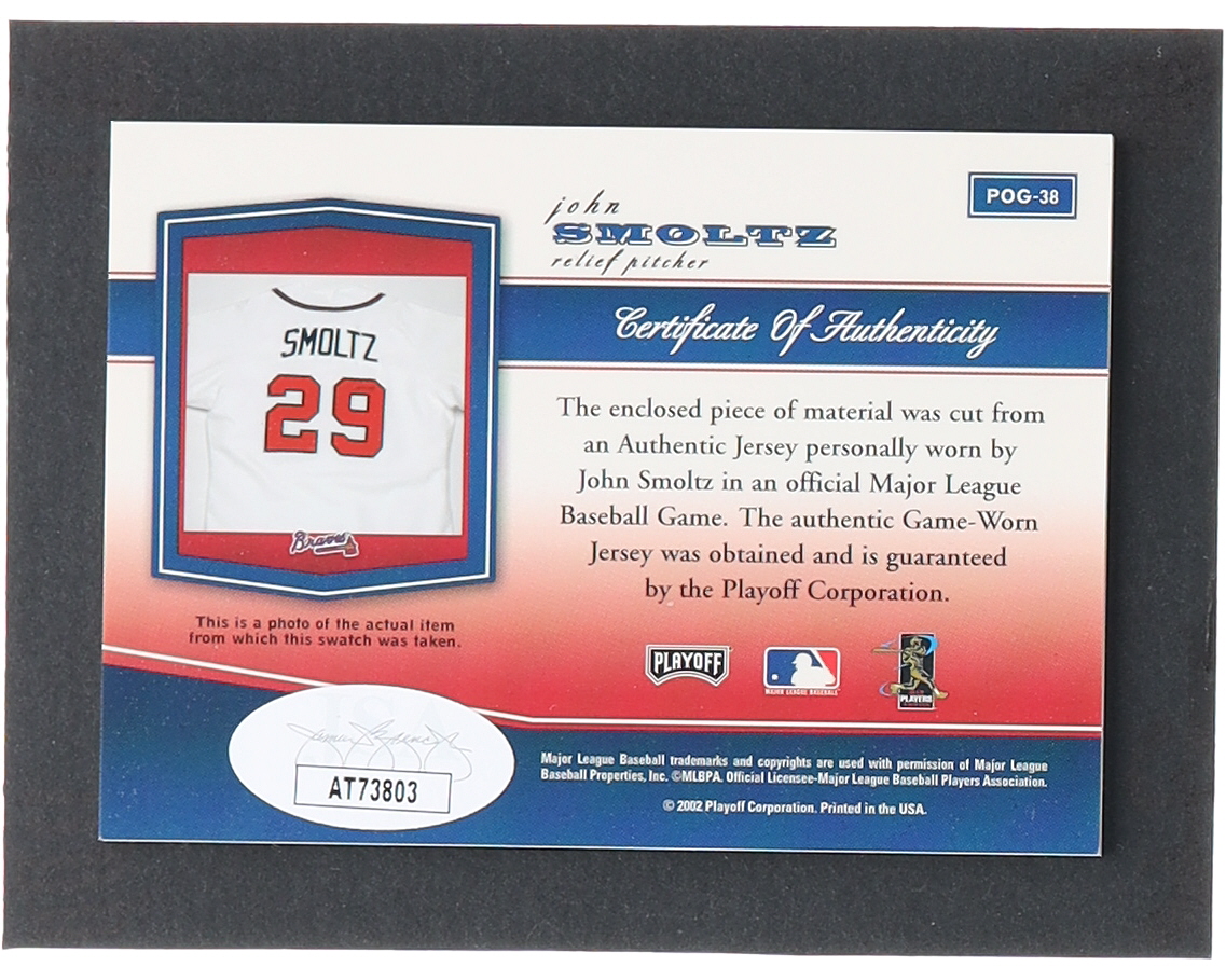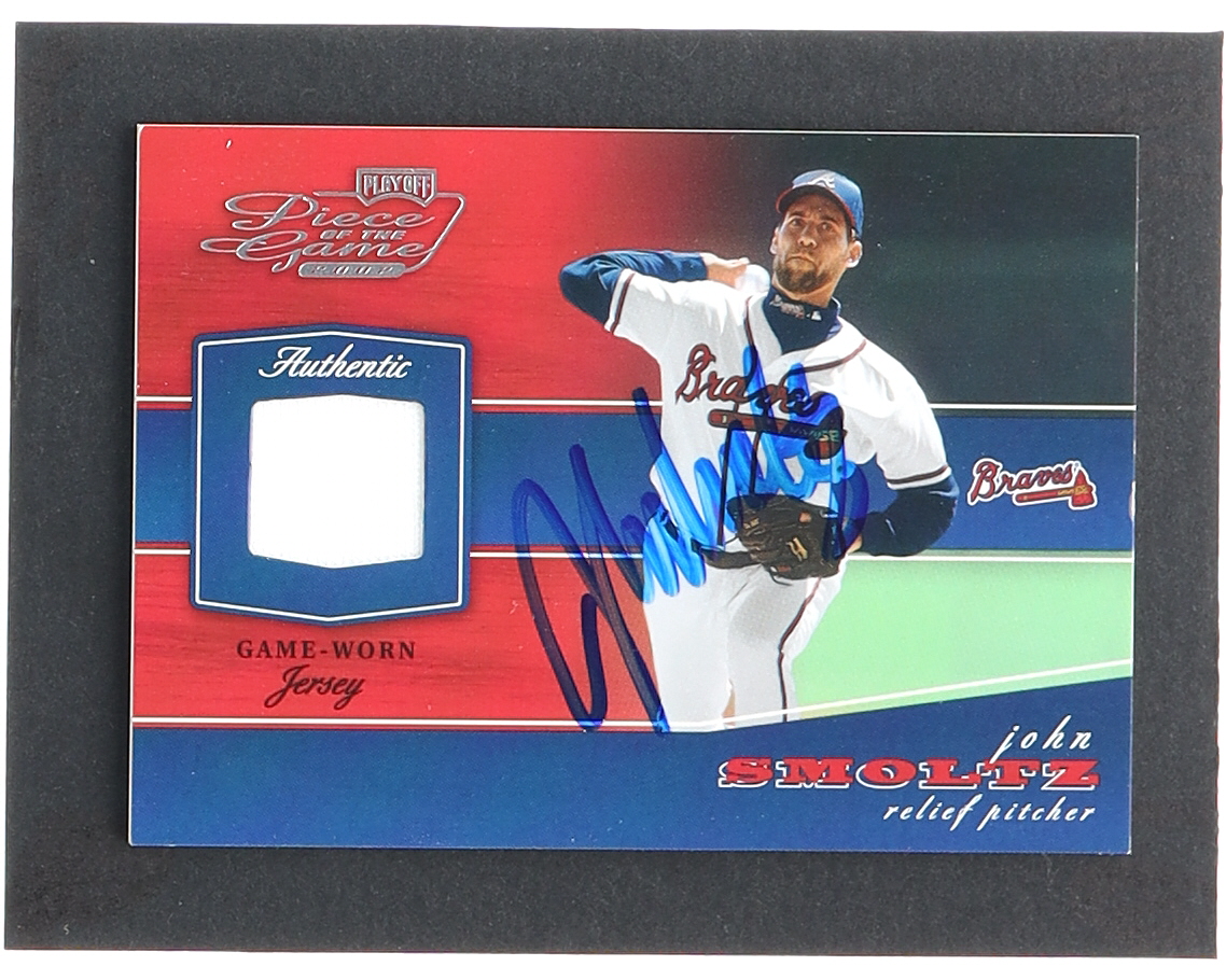 John Smoltz Signed 2002 Playoff Piece of the Game Materials #38A Jersey (JSA)