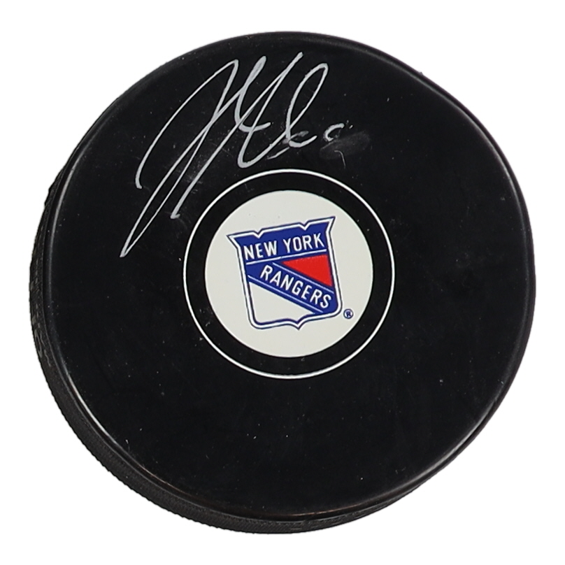 New York Rangers Logo Hockey Puck. Hand-signed by Jacob Trouba. Please note, the signature is smudged.