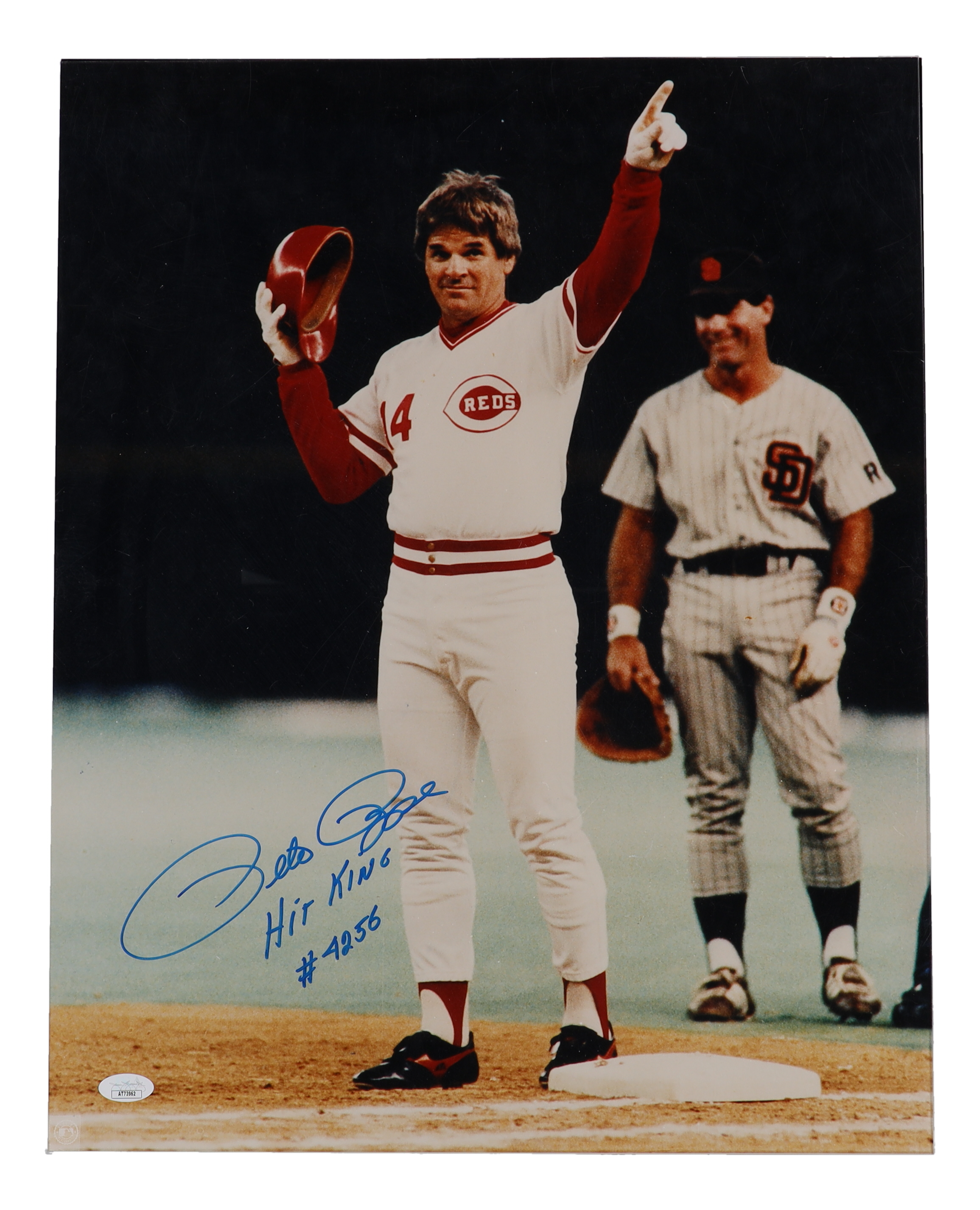 Photo measures 16" x 20" in size. Hand-signed and inscribed by Pete Rose (Cincinnati Reds).