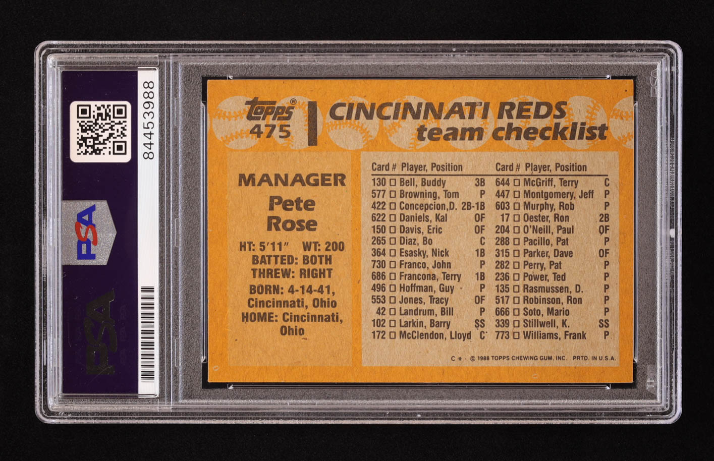 Pete Rose Signed 1988 Topps #475 MG (PSA)