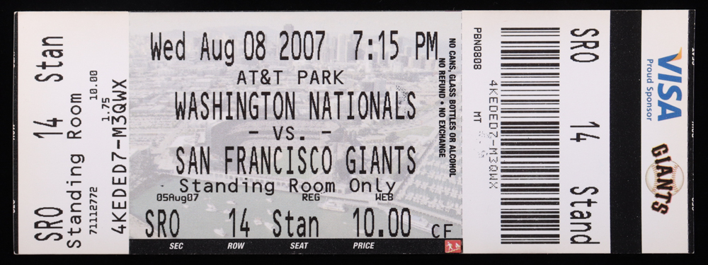 2007 Giants vs Nationals - Barry Bonds 757th HR Game Ticket