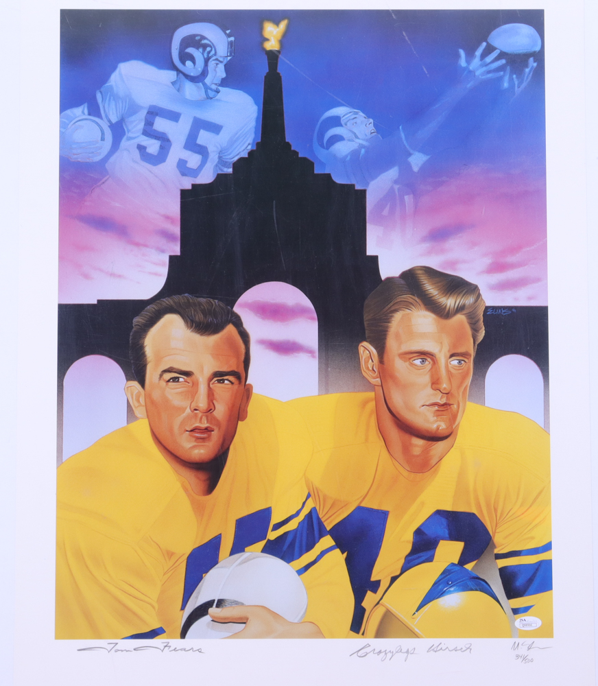 Lithograph measures approximately 22" x 28" in size and has been hand-signed by Tom Fears and Elroy "Crazylegs" Hirsch (Los Angeles Rams, HOF). Please note, there is some scuffing, residue, corner and edge wear. The lithograph is limited edition and you will receive a random number /500.